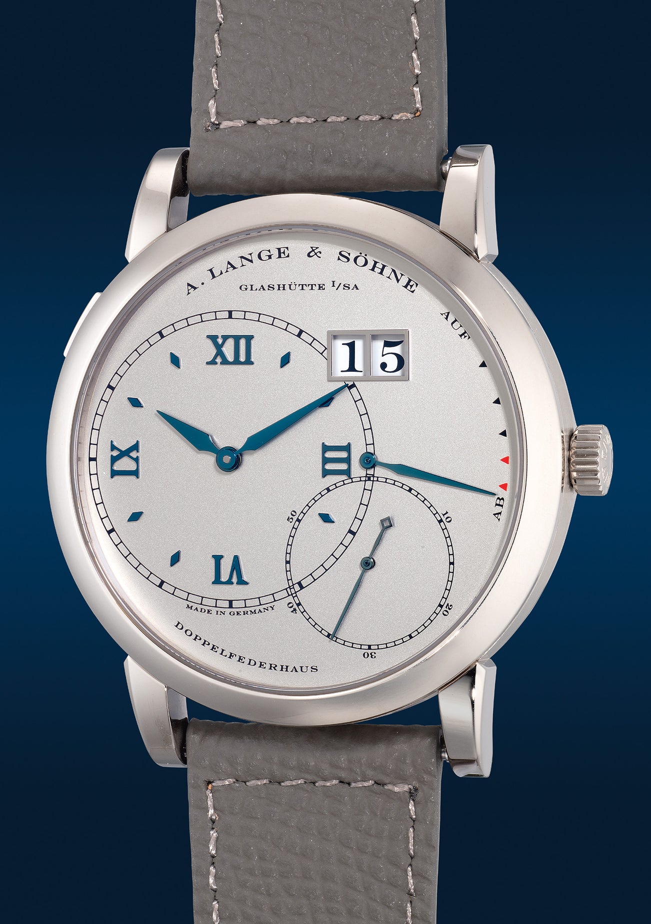 朗格,「Grand Lange 1,Blue Italia」型號115.046,非常精細罕有,限量版白金腕錶,備日期、動力儲存顯示,特為意大利市場限量發行100枚,編號82號,約2008年製。附原裝證書、錶盒