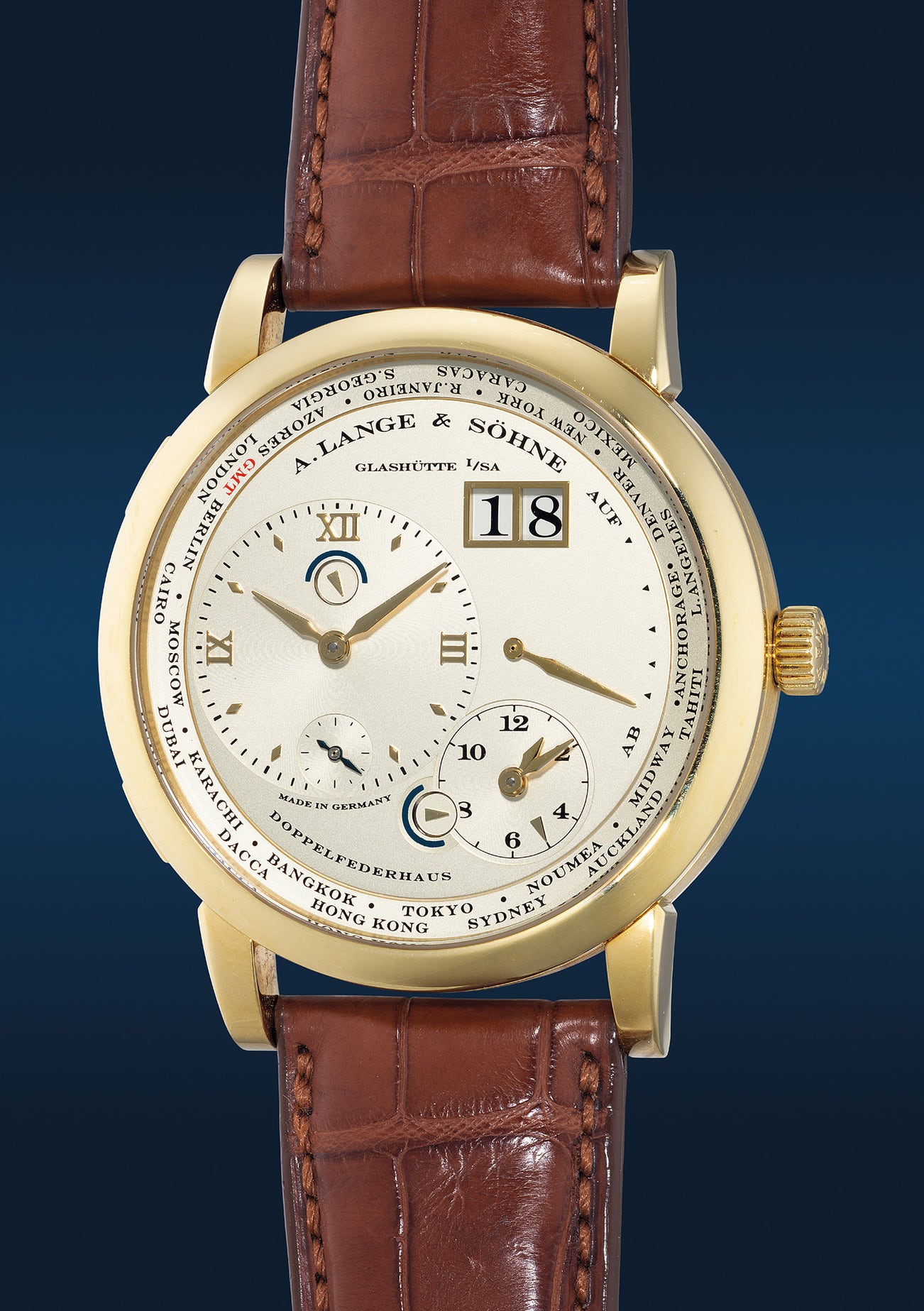 朗格,「Lange 1 Time Zone」型號116.021,精細, 黃金世界時區腕錶,備小秒針、日期、兩地日夜顯示、動力儲存,約2007年製。附錶盒、原裝證書