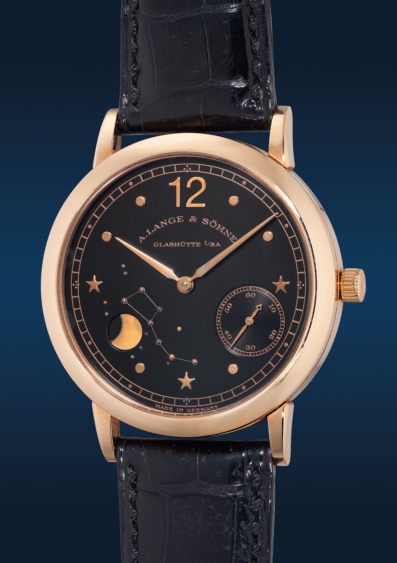 Instead of the standard Arabic numerals found in the 1815 collection, the “Emil Lange” comes with only the Arabic number 12 and round pink gold applique indices. The 3, 6 and 9 o’clock indices are replaced with exquisite applied stars, which resonate with the seven gold appliques depicting the Big Dipper in the constellation Ursa Major (one of the most distinctive asterisms in the sky) at the 6 to 8 o’clock. Amid the stars, one is captivated by the lustrous moon disc which has aged beautifully with alluring patina.