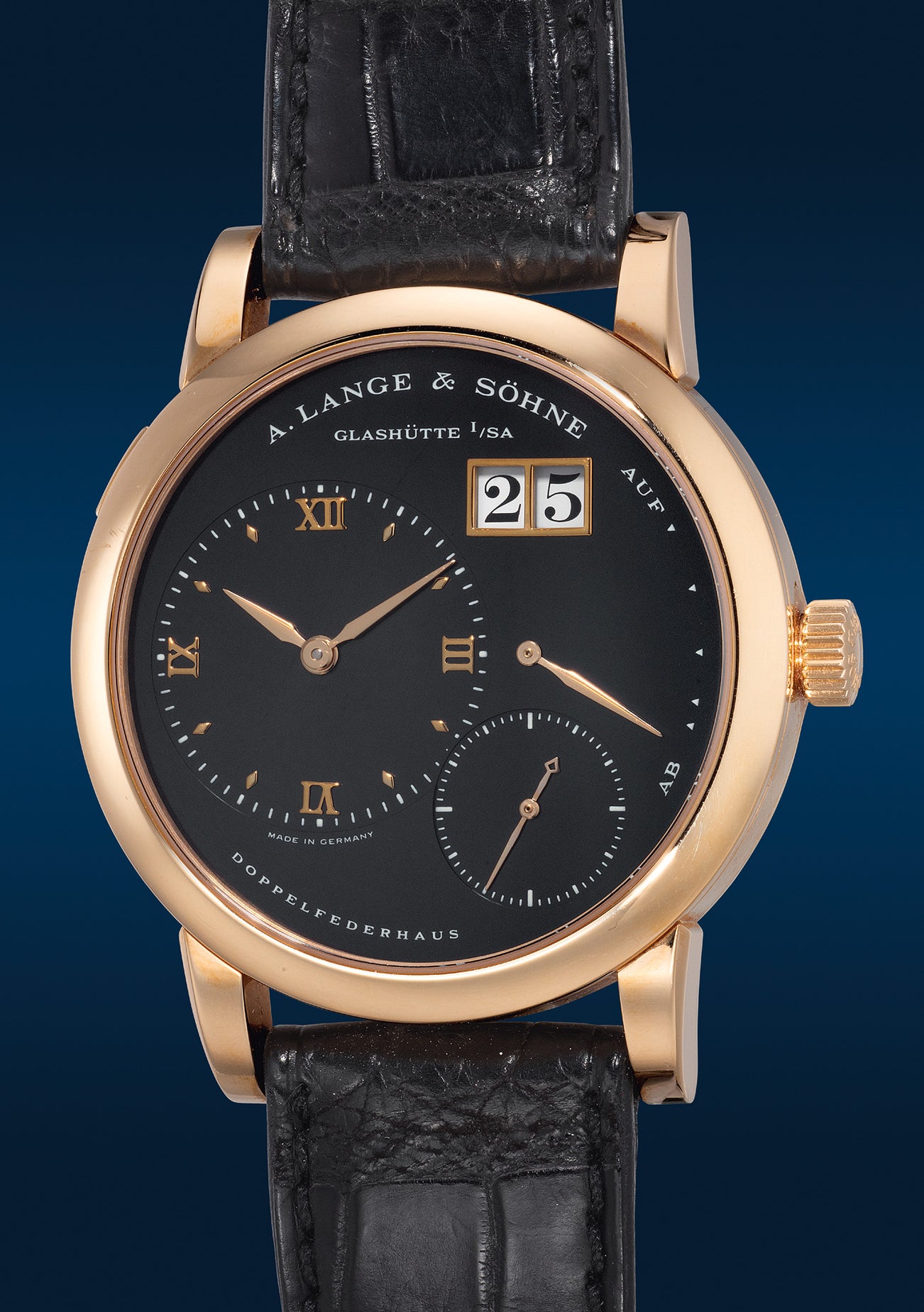 朗格,「Lange 1」 型號101.031 精細, 玫瑰金腕錶, 備黑色錶盤、日期、動力儲存顯示, 約1998年製。附原裝證書、錶盒、配件