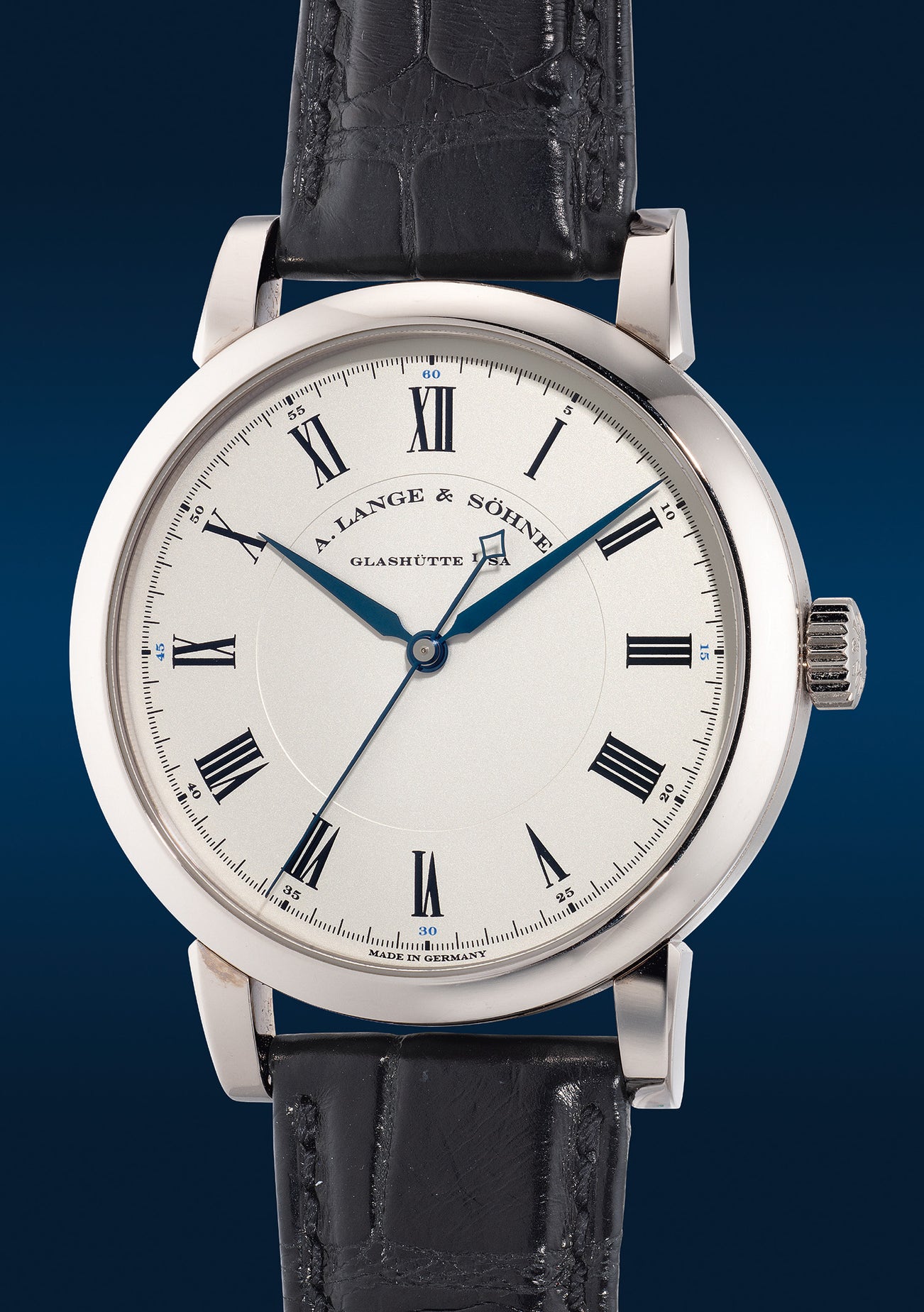 Introduced in 2006 as a revival of scientific observatory watches, the Richard Lange family features a traditional three-hand design with a prominent sweep seconds hand. The reference 232.026, specifically, is encased in white gold and showcases the signature blued hands and accents that are icons of A. Lange & Söhne timepieces. This particular model introduced in 2013 is exclusively available in A. Lange & Söhne boutiques.