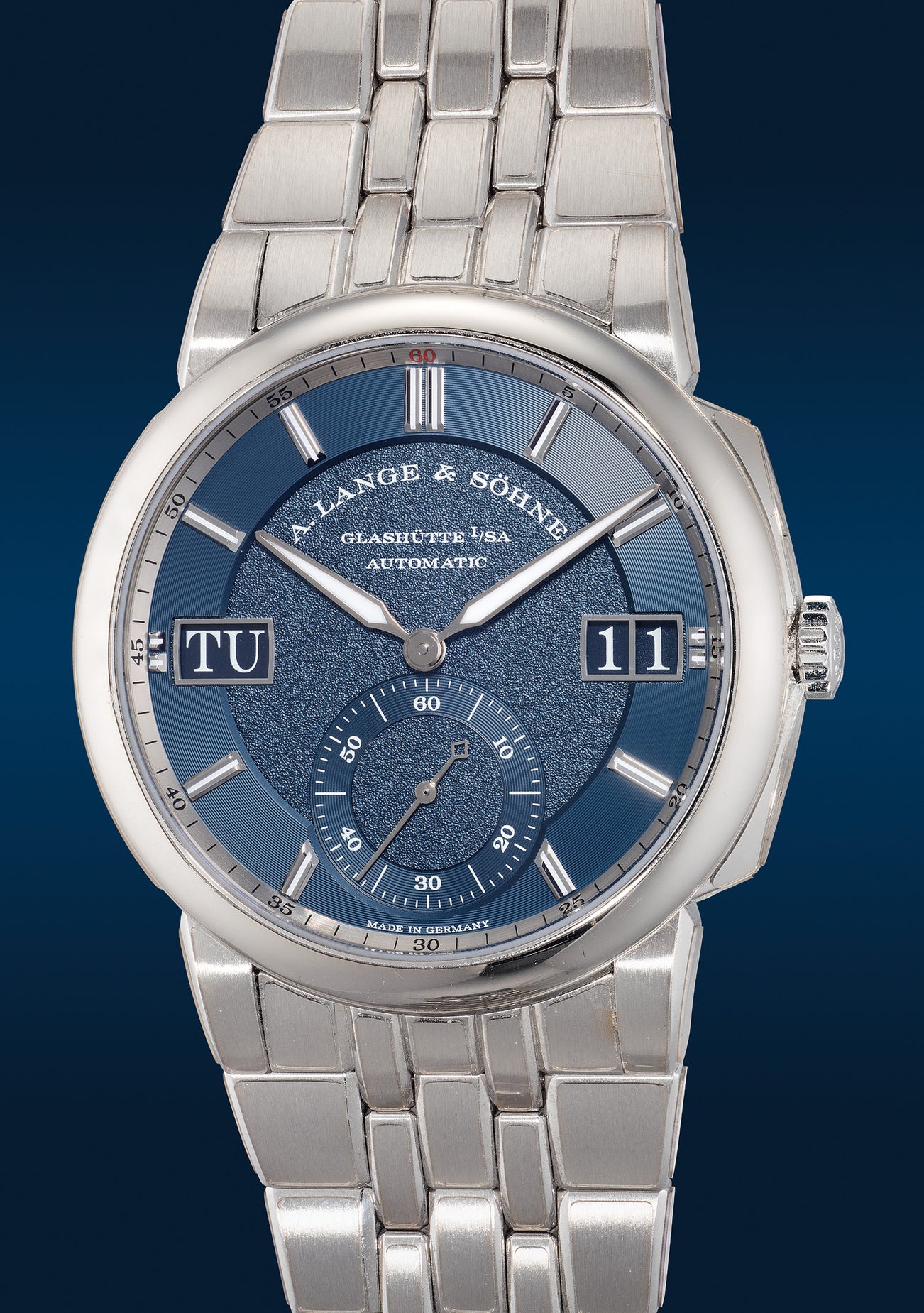 The present Odysseus with a blue dial is in pristine condition and comes with its guarantee and presentation box. It is undoubtedly a timepiece that will catch the eye of seasoned Lange collectors, offering a unique addition to their collection.