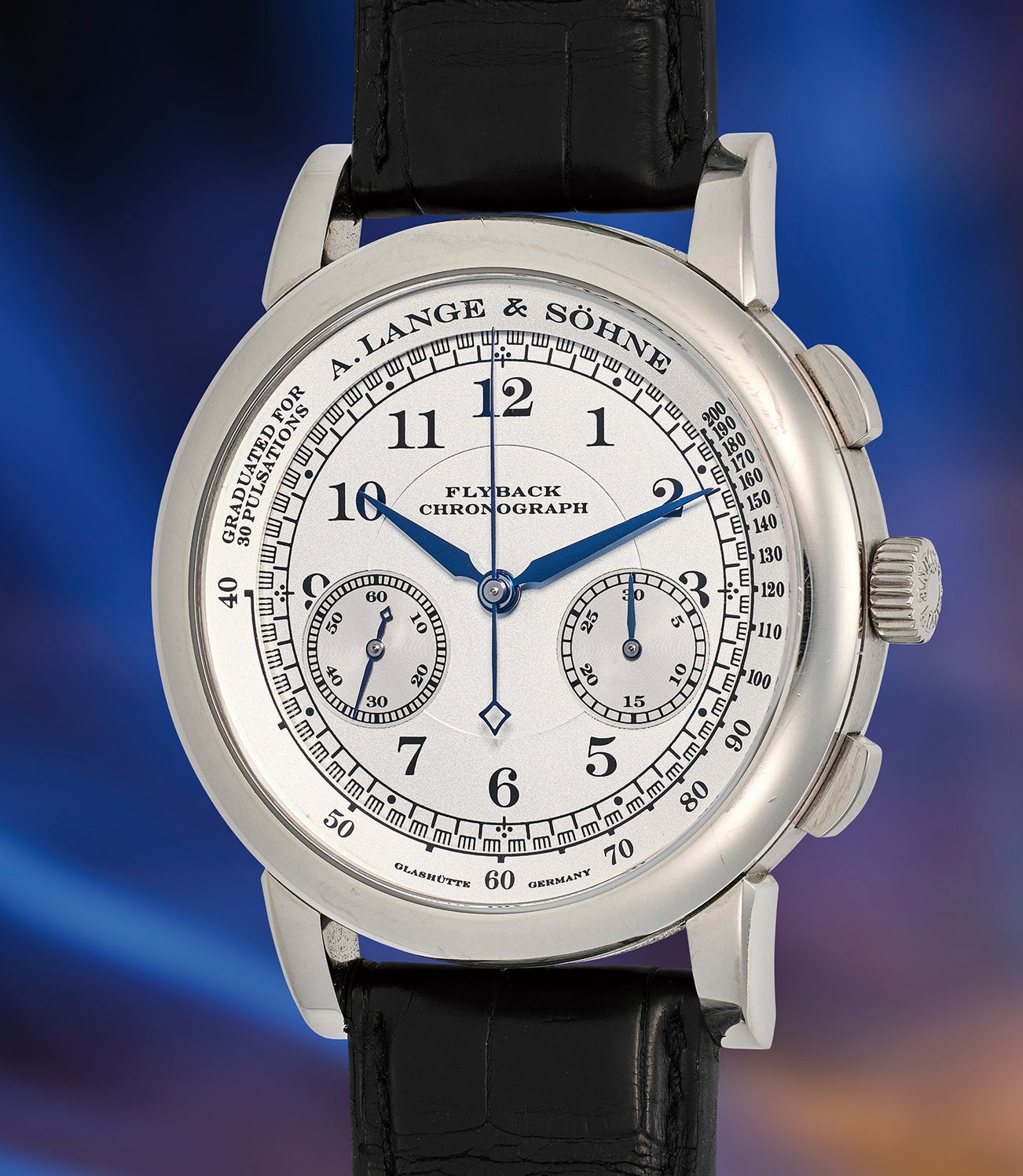 朗格,非常優雅,白金飛返計時腕錶,備設速圈刻度。附保證書及錶盒