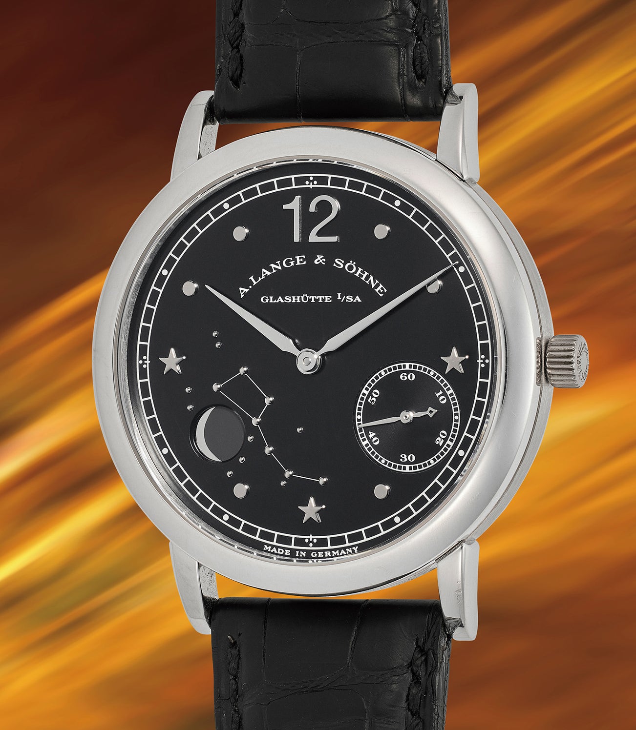 The 1815 Emil Lange Moon phase reflects traditional Saxony watchmaking with a modern twist. The dial is captivating with its offset small seconds register at 4 o’clock and moonphase display at 8 o’clock and the “Big Dipper” constellation represented. The model sold out quickly and became a classic, with the brand relaunching the watch in 2010 in a larger case made of their proprietary honey gold alloy and with guilloché dial.