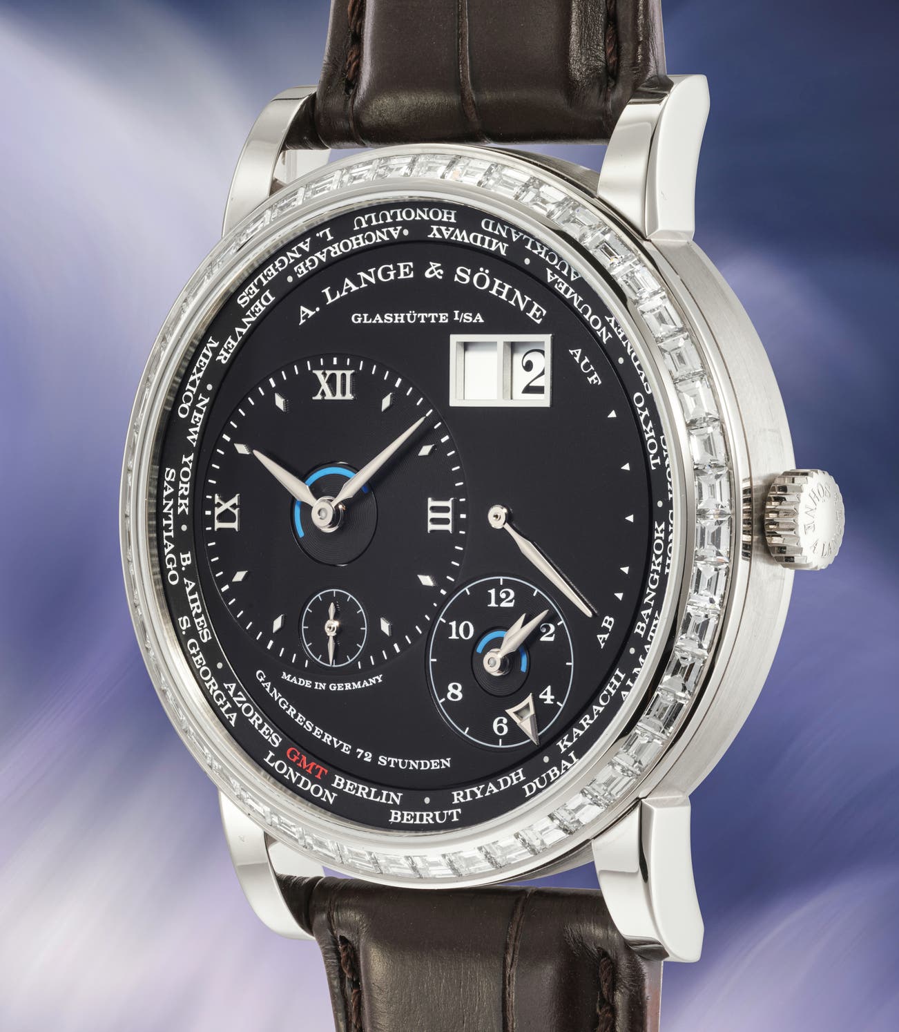 - Rare Lange 1 Zeitzone with baguette diamond bezel