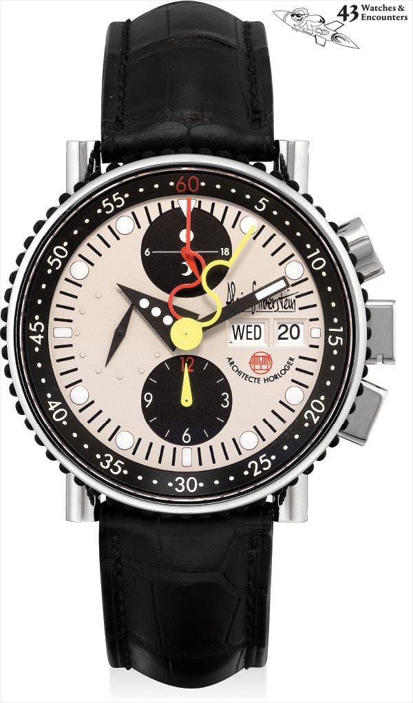 'Alain Silberstein is best known for his playful and colourful approach to watchmaking. This chronograph with day and date is fitted with a highly unusual movement that is made up of multi colour components and is offered in close to new condition.'