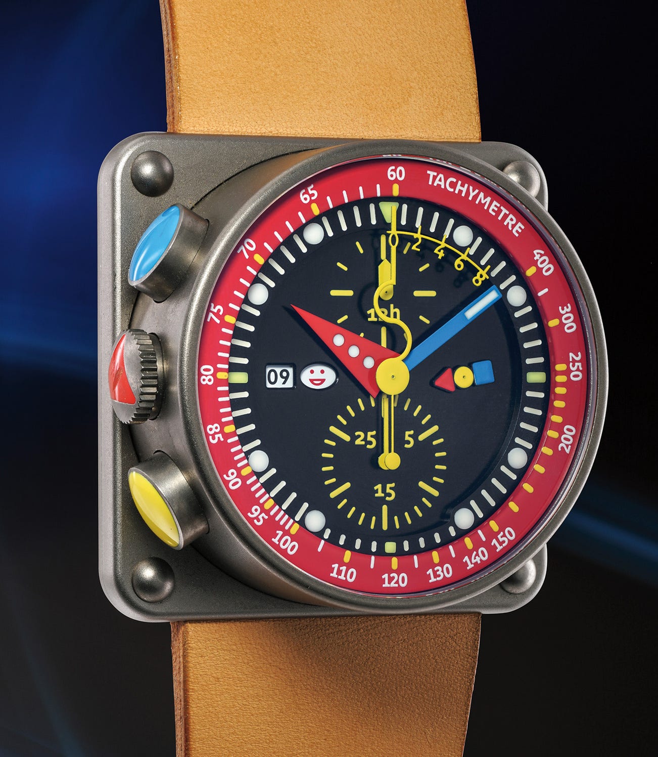 Made in France, the present watch is a reflection of Alain Silberstein's whimsy and creativity. Cased in titanium, the automatic chronograph wristwatch sits on a square case. Primary colors are featured throughout the dial, as well as the date and chronograph pushers. Architectural and surprising, it best displays the unusual way that Alain Silberstein makes his creations. Furthermore, the dial is made lively due to emoticons - one can assume the smiley face represents the weekend, while the unhappy face signified the working week day.
