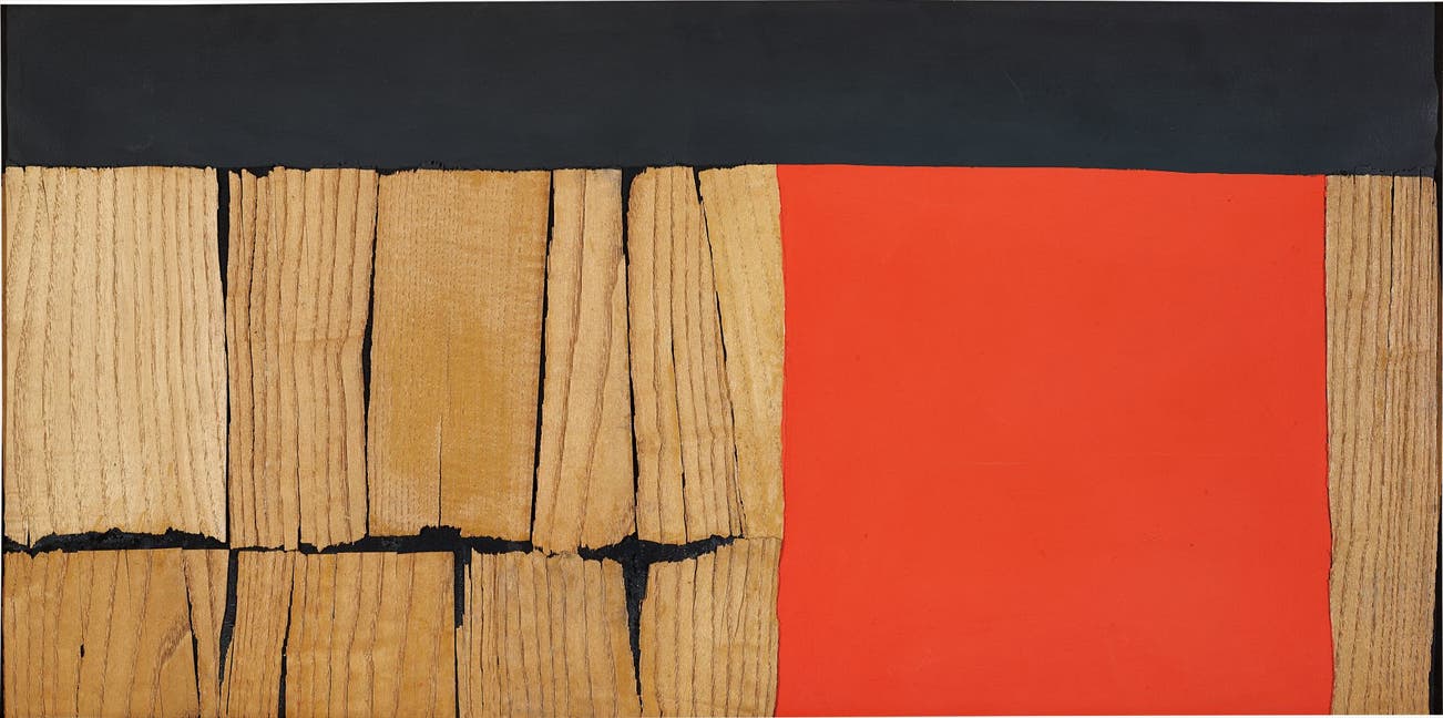 In Alberto Burri's Legno, a vibrant rectangle of luscious crimson is starkly juxtaposed, and contrasted, with the warm, organic sensuality of fragments of wood; each filled with, and glorying, in its innate ornamentation. Executed in 1959, this seminal work belongs to Burri's series of Legni: wood-based works that emerged following his previous Sacchi. Where the tattered, rough-hewn sackcloth of those earlier works had spoken of certain threads of poverty – be they personal, artistic or intellectual – engaging the viewer with the drudgery of repetitive labour, as well as asking of them to reconsider their calibration of the hierarchy of media and, by extension, the manner in which they looked at, and appreciated, visual art, the Legni saw Burri turn to modern construction materials. Now, instead of reviving scraps of material by sewing them together, the artist transformed the found strips of wood by destroying or defacing them, and, in some cases, even burning it. Thus Burri’s visual vocabulary became more complex; continuing to employ the simplest of ‘matter’, but now directly confronting it and re-shaping its form (and meaning) directly on to his supports.