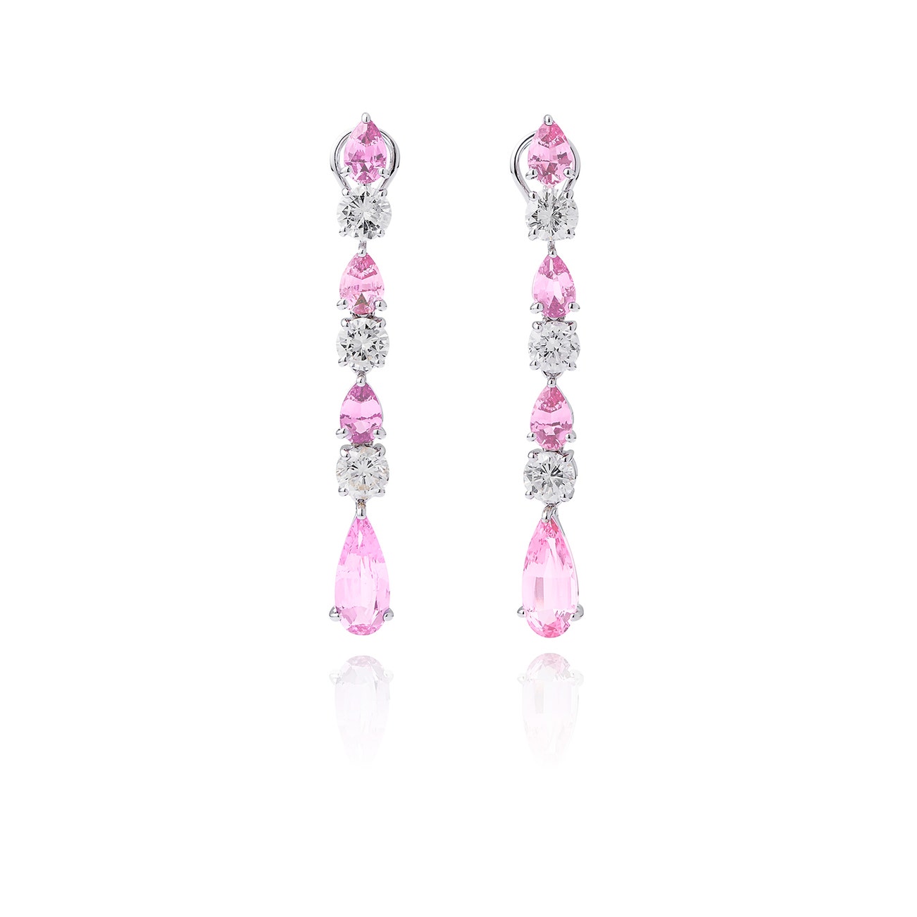 Each set with a pear-shaped spinel weighing 1.84 and 2.33 carats respectively, suspended from a line of alternating brilliant-cut diamonds and pear-shaped spinels, length approximately 57mm, each signed Laut for Alexander Laut, numbered, post and hinged-back fitting.