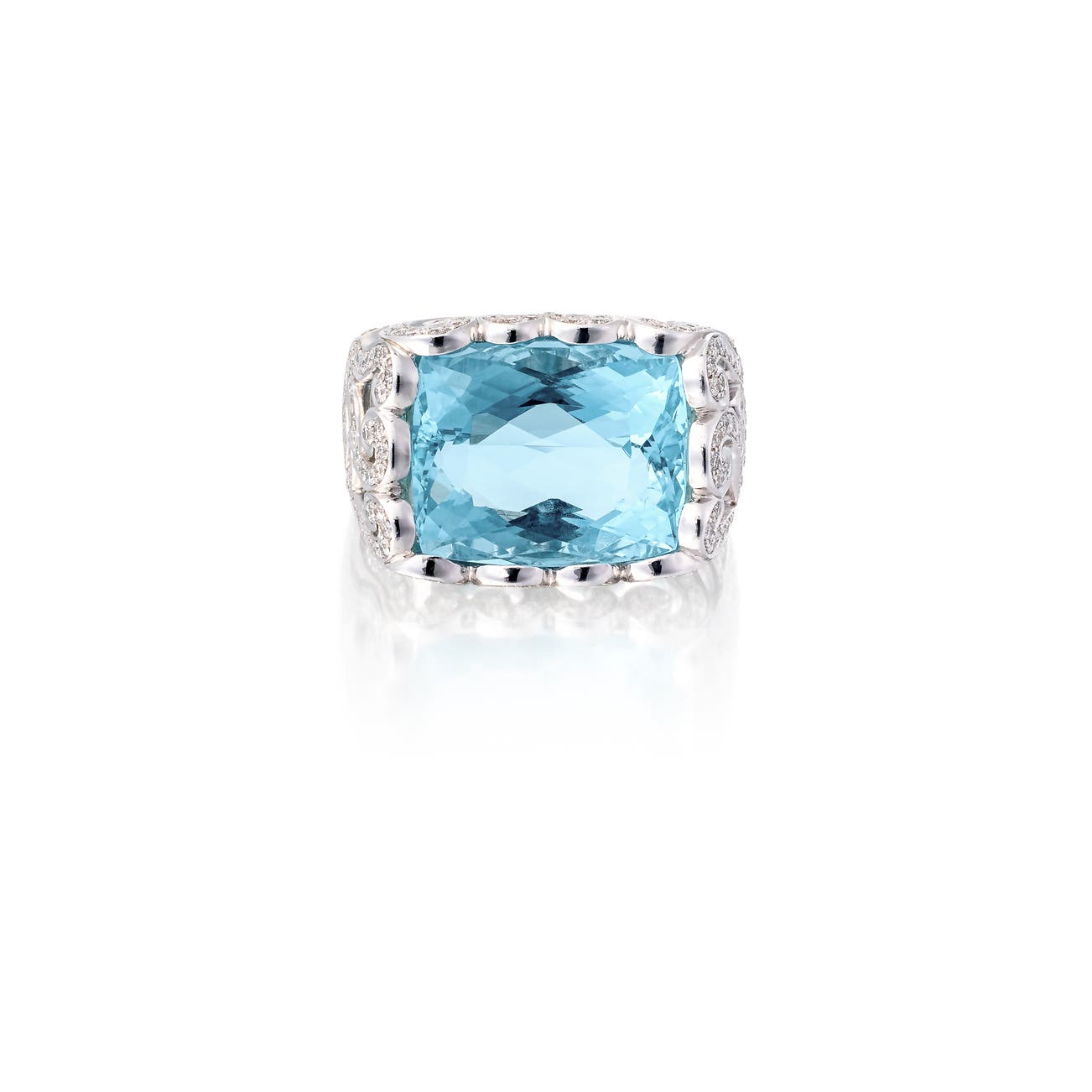 Set with a cushion-shaped aquamarine weighing 10.50 carats, accented with brilliant-cut diamonds, size 54½, signed Laut for Alexander Laut, numbered.