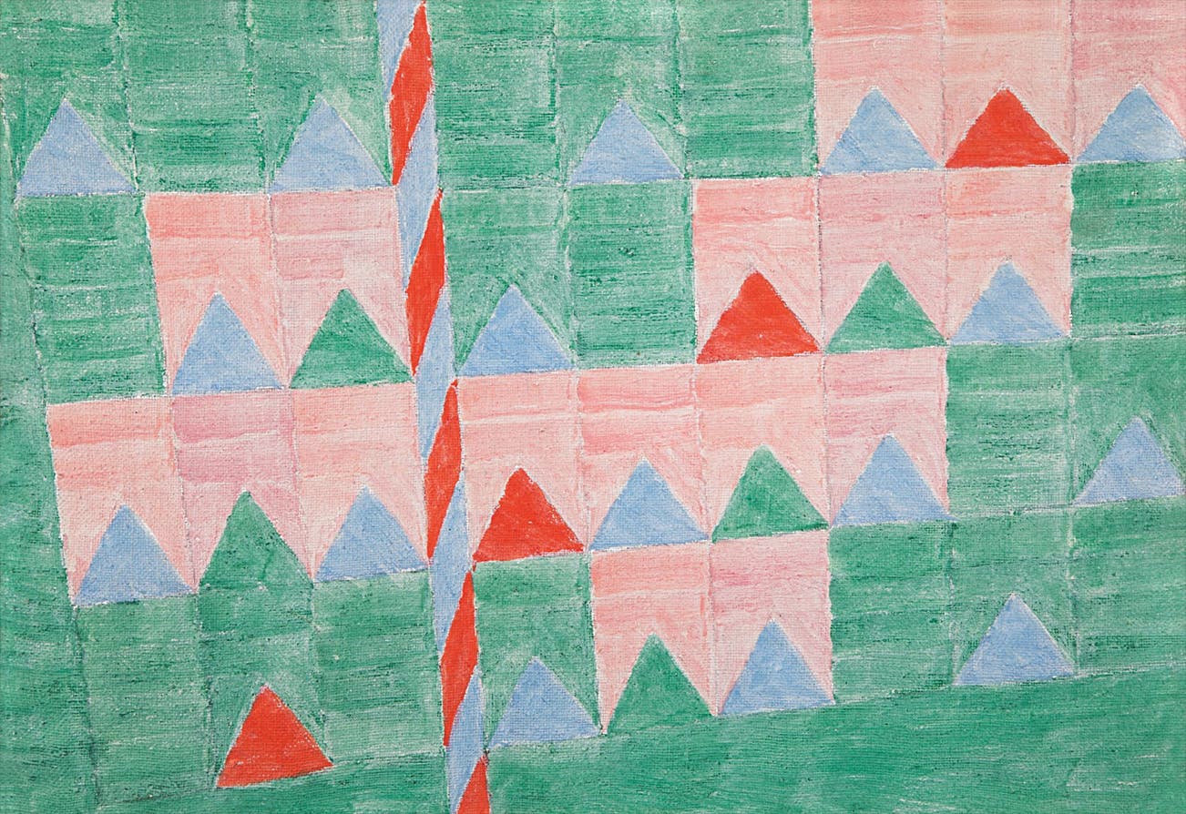 Alfredo Volpi’s significance within the international art milieu is intimately tied to his personal life. The son of Italian immigrants, Volpi grew up in a lower-middle-class neighborhood in Brazil, where he worked as a decorator, painting in Renaissance and Moorish styles. Despite being self-taught, he participated in dialogues with other artists and intellectuals in every phase of his oeuvre, acutely observing his neighborhood’s various landscapes, homes and terraces. In 1950, Volpi made a noteworthy trip to Italy and France. There—much like the self-taught conceptual artist Robert Ryman—Volpi studied medieval art extensively for six months. This prompted a radical shift in his style, resulting in his most important series of works, Banderihnas (Small Flags), exemplified in the work we see here.