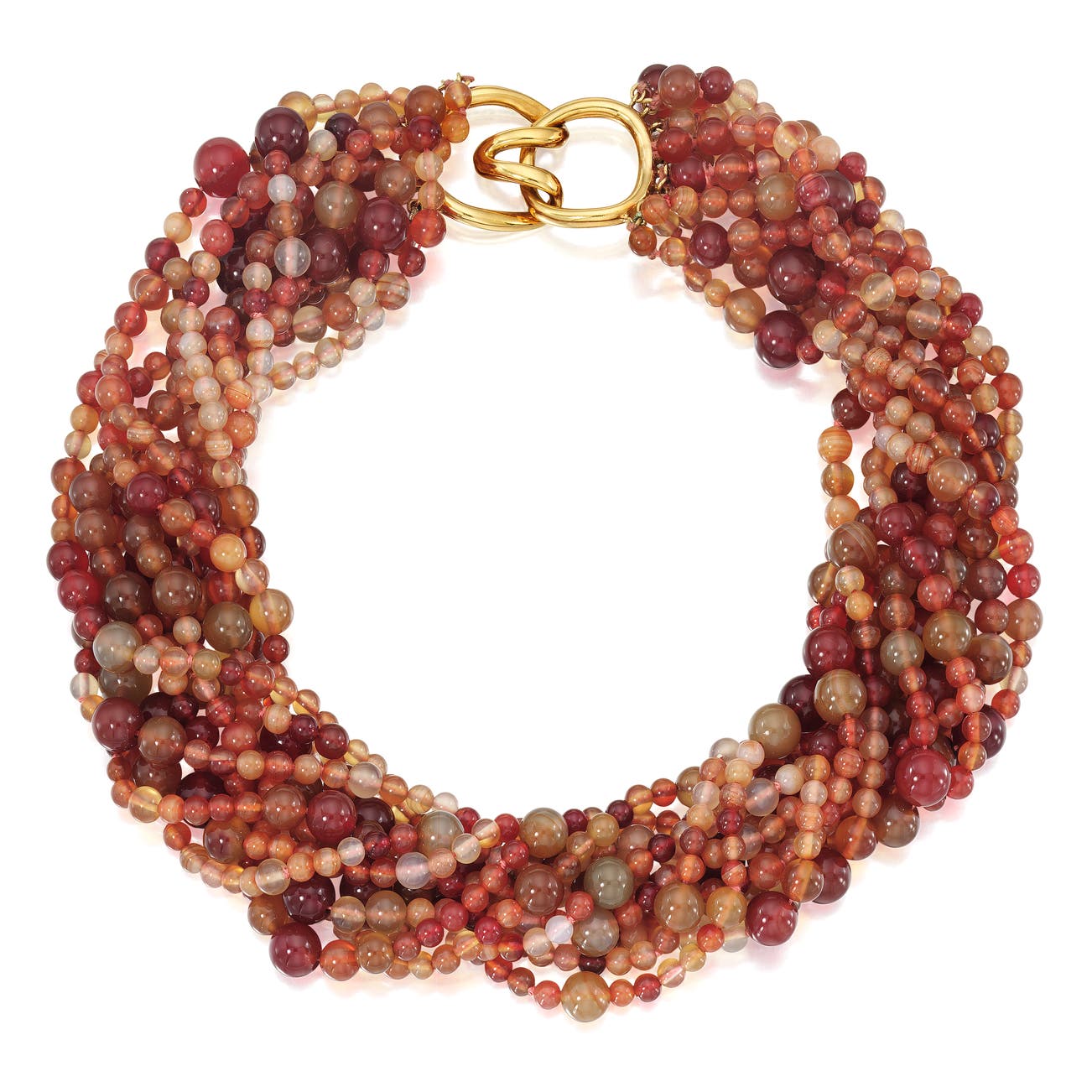 Set with agate, quartz and carnelian beads, clasp made of 18k yellow gold, length approximately 16 inches, signed Tiffany & Co. Cummings.
