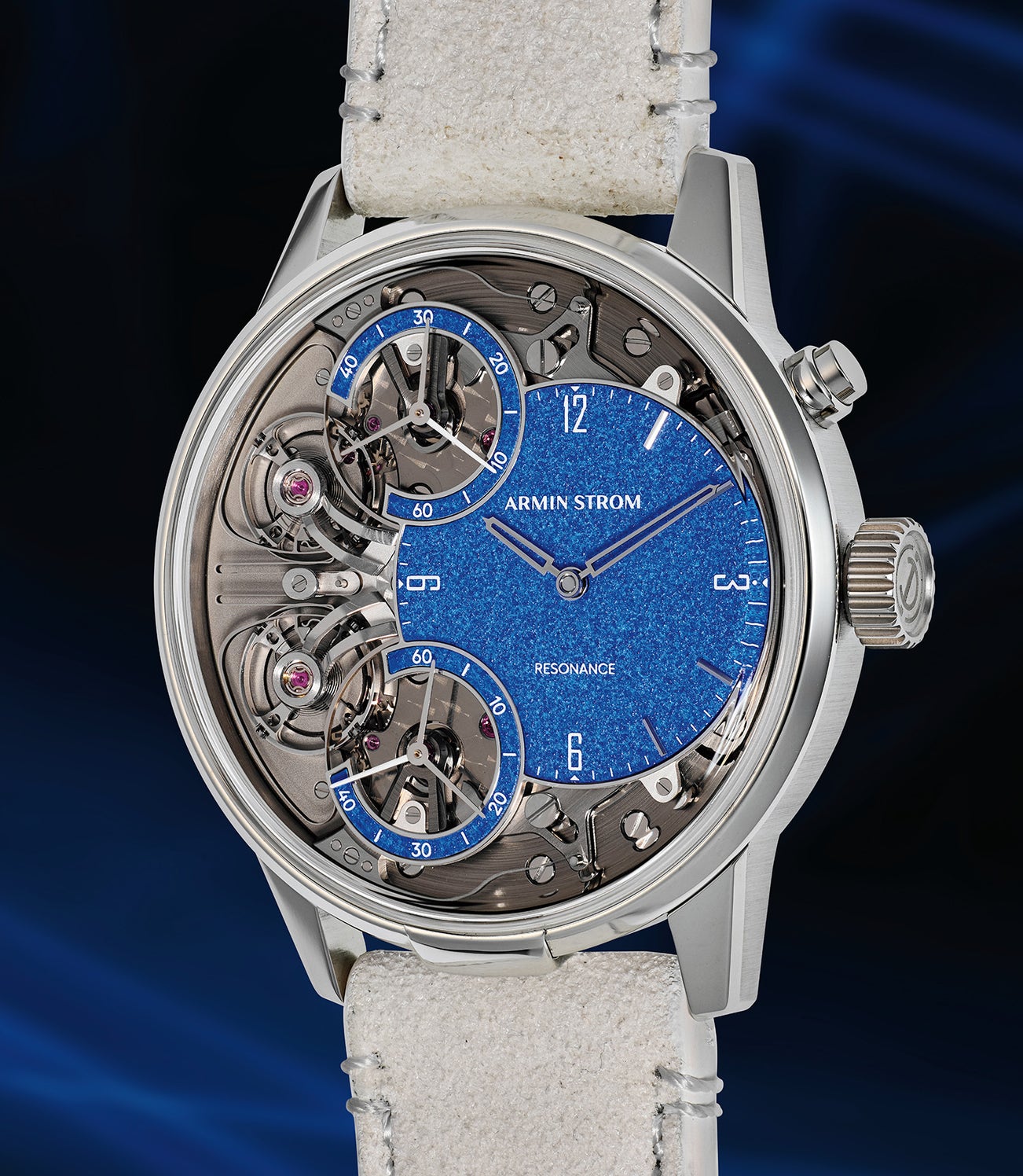 Designed, manufactured, and painstakingly hand-decorated in-house, the hand-wound movement has a 48-hour power reserve. The open movement framing the unique blue dial is a showcase for the masterful hand-decoration techniques of Armin Strom’s watchmakers. The three-dimensional balance wheel bridges and all bevels are polished by hand, and on the dial side, the surfaces are frosted, perlaged, or circular grained by hand. All parts of the movement – including those that are no longer visible after assembly – are hand-decorated with the utmost care. In addition, the movement is assembled twice by hand to ensure uncompromising quality.