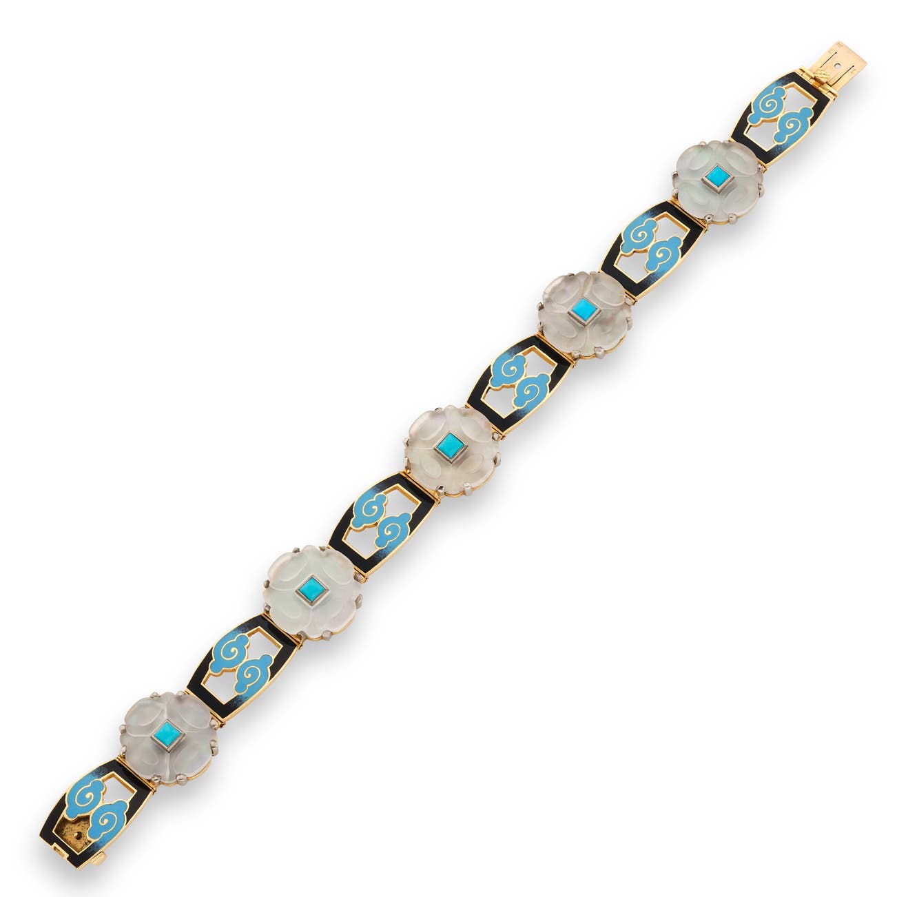 Designed as a line of five carved rock crystal panels each accented with a cabochon turquoise, alternating with black and blue enamelled openwork links, length approximately 820mm, attributed to Marzo, French assay mark for gold.
