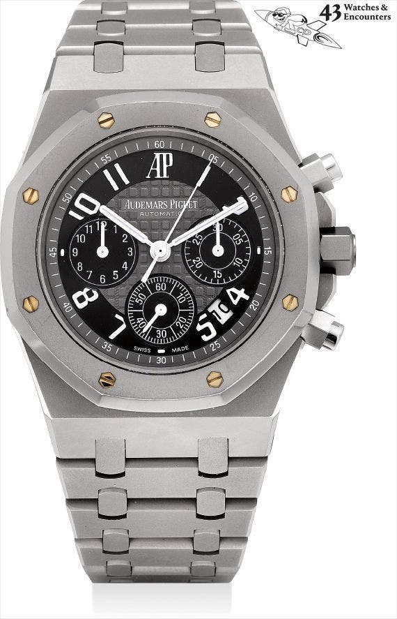 愛彼,精細及罕有,鈦金屬自動上弦鏈帶腕錶,配計時功能、日曆顯示、袖口鈕、開信刀、紙鎮及皮製旅行袋,“Royal Oak Chronograph”,型號26041TI.GG.1110TI.01,特別為巴黎分店限量生產50枚,約2005年製