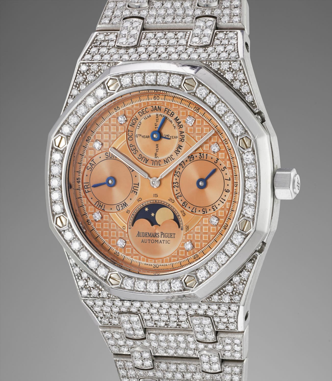 A fine and unique platinum and diamond-set perpetual calendar wristwatch with bracelet, moonphases and salmon dial