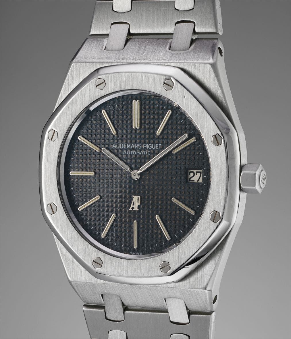 The Royal Oak was presented in 1972. It was at the time the world’s most expensive steel watch, costing even more than some of the brand’s gold cased watches. Interestingly, the Royal Oak housed the extra slim caliber 2121 (developed by Jaeger LeCoultre as caliber 920), a caliber used by the three great Swiss makers in their luxury steel sports watches of the 1970s: Patek Philippe's Nautilus, Vacheron Constantin's 222 and of course Audemars Piguet with the Royal Oak.