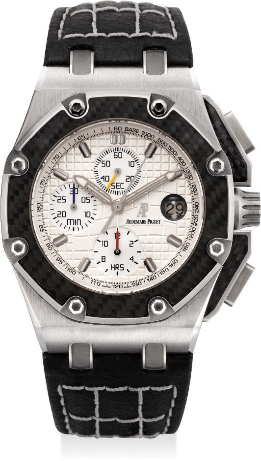 愛彼,「Royal Oak Offshore Juan Pablo Montoya Chronograph」型號26030,精細及罕有,限量版鍛造碳及鈦合金自動上弦腕錶,配計時功能和日期顯示,限量發行1000枚,編號第952號,約2005年製。附錶盒和證書