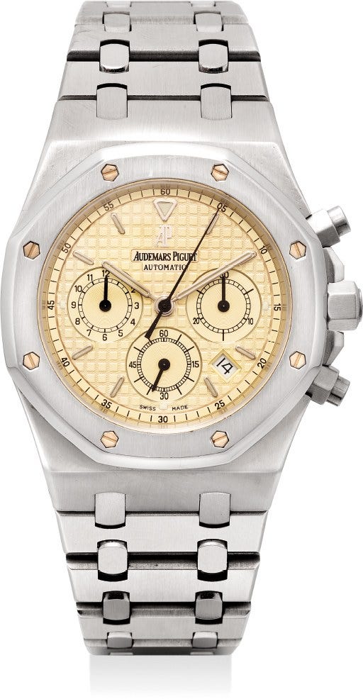 愛彼,「Royal Oak Chronograph」型號25860ST,罕有,精鋼自動上弦鏈帶腕錶,配計時功能、日期顯示和罕有奶油色錶盤,約2000年製。附錶盒和證書