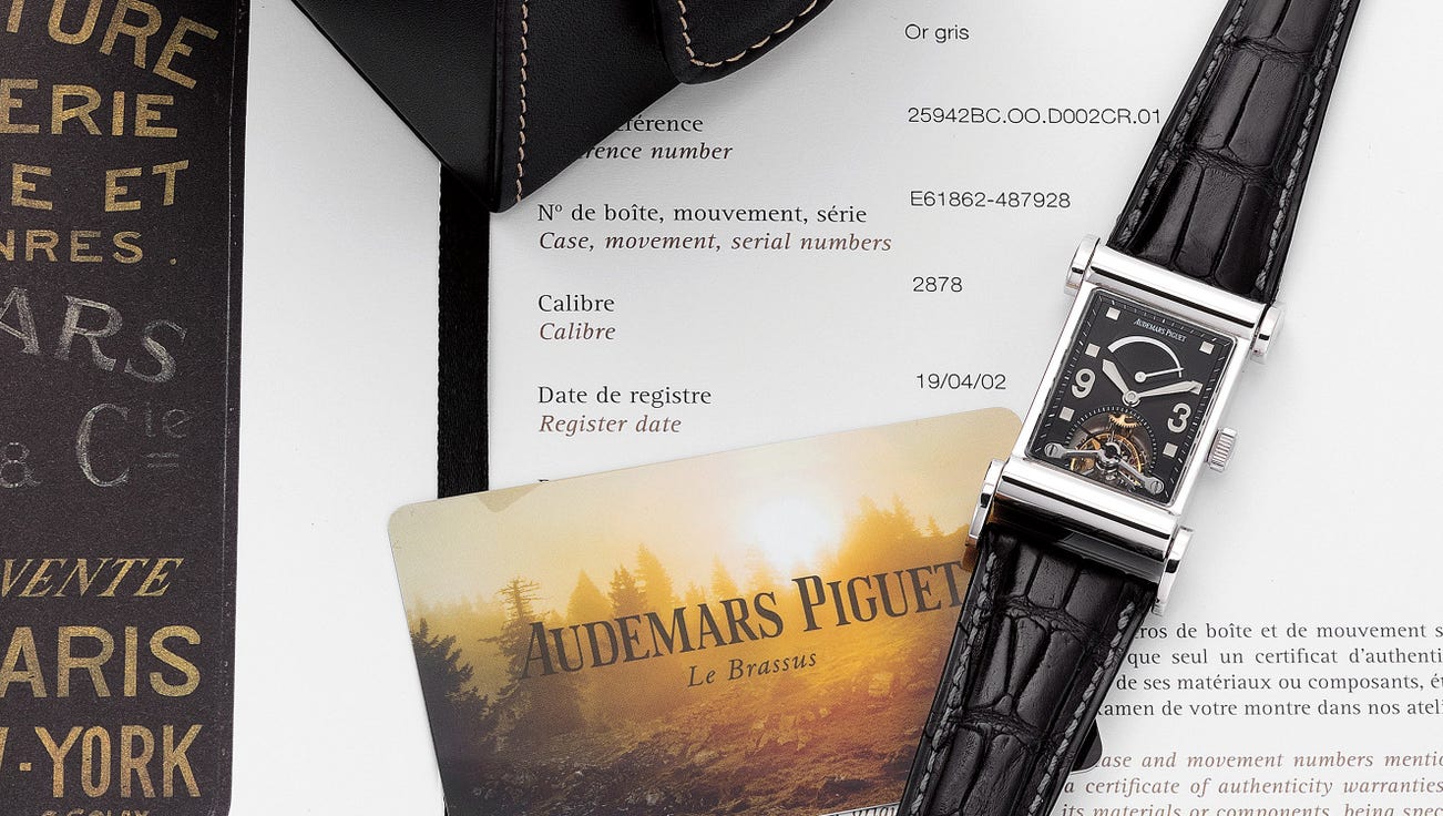 愛彼,「Canapé Tourbillon」型號25942BC.OO.D002CR.01,精細,18K白金陀飛輪腕錶,配動力儲存顯示,2002年製。附後補證書、保養文件