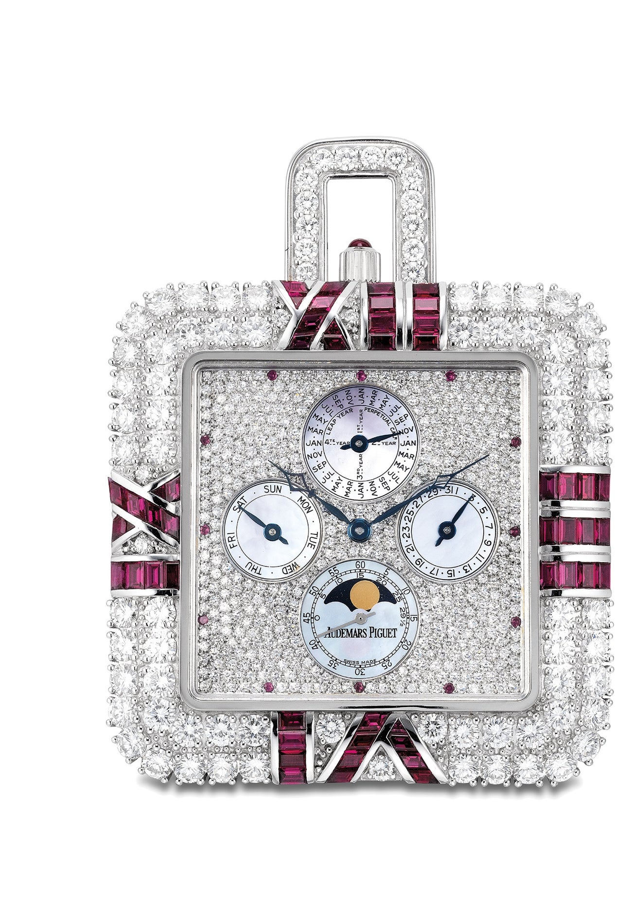 愛彼,極度精細及可能獨一無二,18K白金鑲鑽石、紅寶石、珠母貝,萬年曆懷錶,編號第1號,約1994年製。附錶盒 這款腕錶採用精美的鑽石鑲嵌錶殼,錶殼和錶扣,是藝術和精湛技術的完美結合。 錶殼飾有以紅寶石鑲嵌的12-3-6-9羅馬數字,錶盤和錶冠頂部亦飾有紅寶石圓點時標。