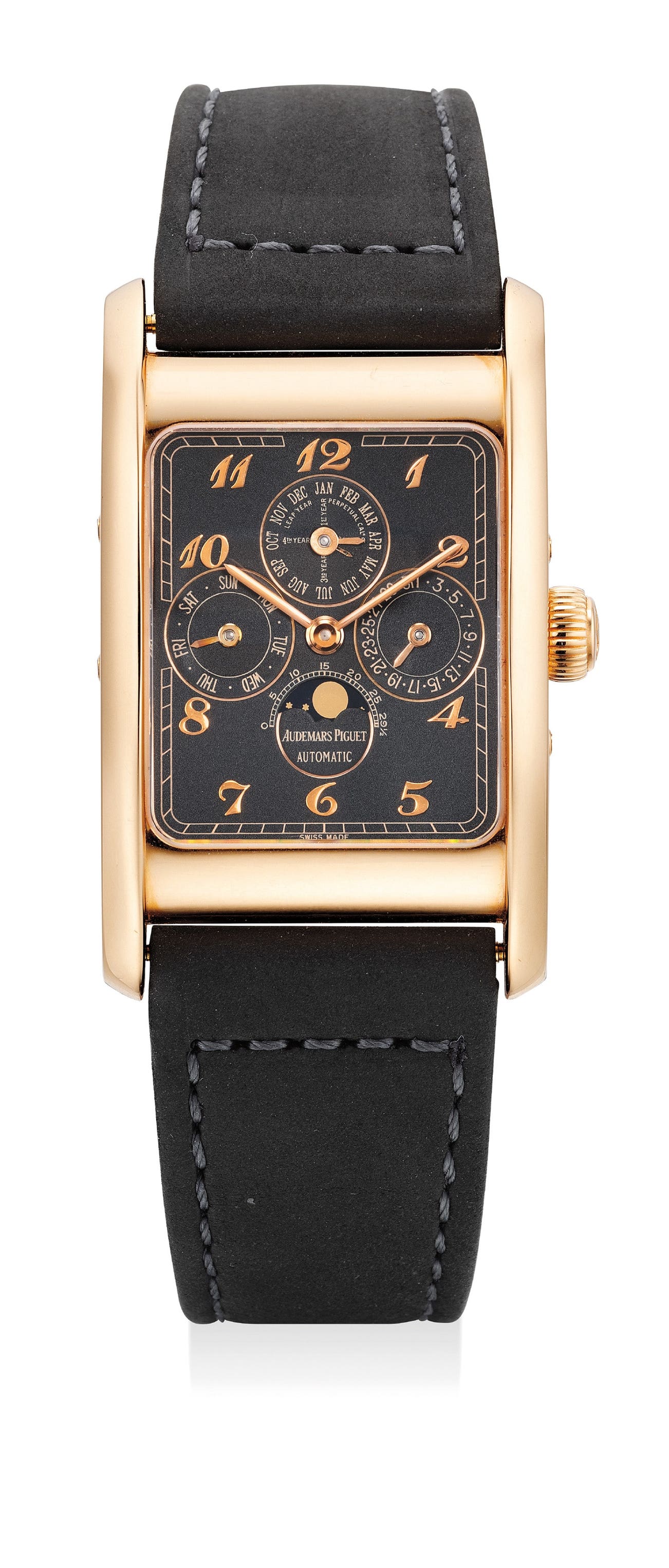 The present lot, a rare “Edward Piguet Quantieme Perpetual”, is a rectangular perpetual calendar wristwatch manufactured by Audemars Piguet with attractive applied Breguet numerals against the matte black dial, housed in a beautiful 18K pink gold case. It is an understated example of an Audemars Piguet perpetual calendar wristwatch.