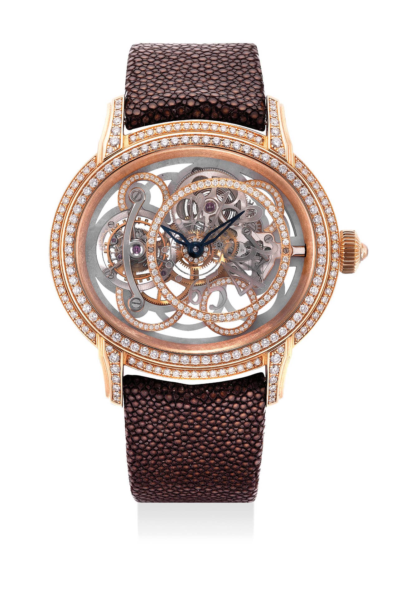愛彼,「Millenary Tourbillon Calcédoine」型號26354OR.ZZ.D080GA.01,十分精細及重要,限量版18K玫瑰金鑲鑽陀飛輪腕錶,約2010年製。附錶盒和證書 這款腕錶真的是一款瑰麗華美的腕錶,結合了鑽石鑲嵌的奢華玫瑰金錶殼與陀飛輪的卓越技術,加上美輪美奐的鏤空錶盤,非常獨特,罕見難得。