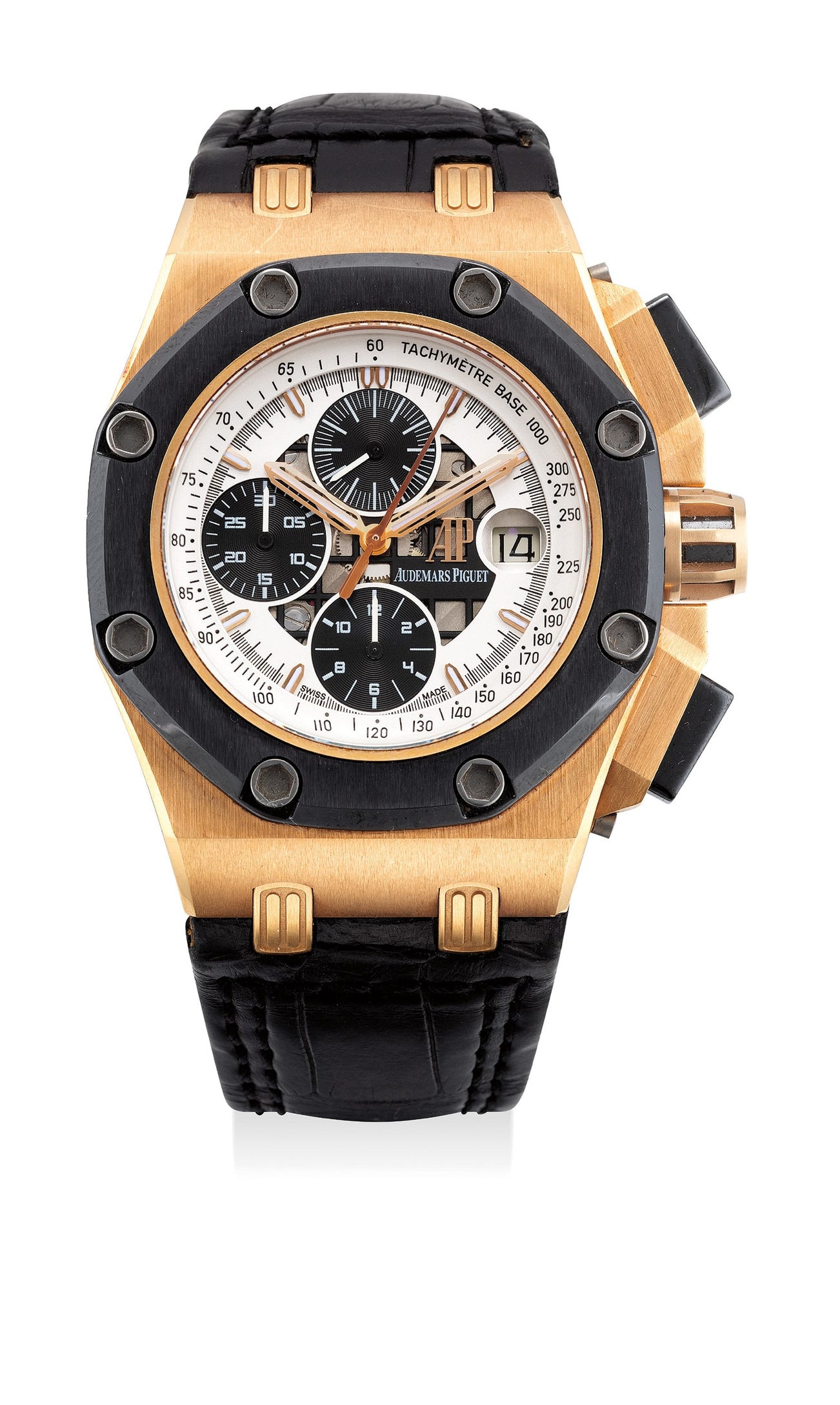 愛彼,「皇家橡樹離岸型Rubens Barrichello II」型號 26078RO.OO.D001VS.01,精細,限量版18K玫瑰金和陶瓷自動上弦腕錶,配計時功能和日期顯示,限量發行500枚,編號第374號,約2006年製。附維修錶盒和後補證書