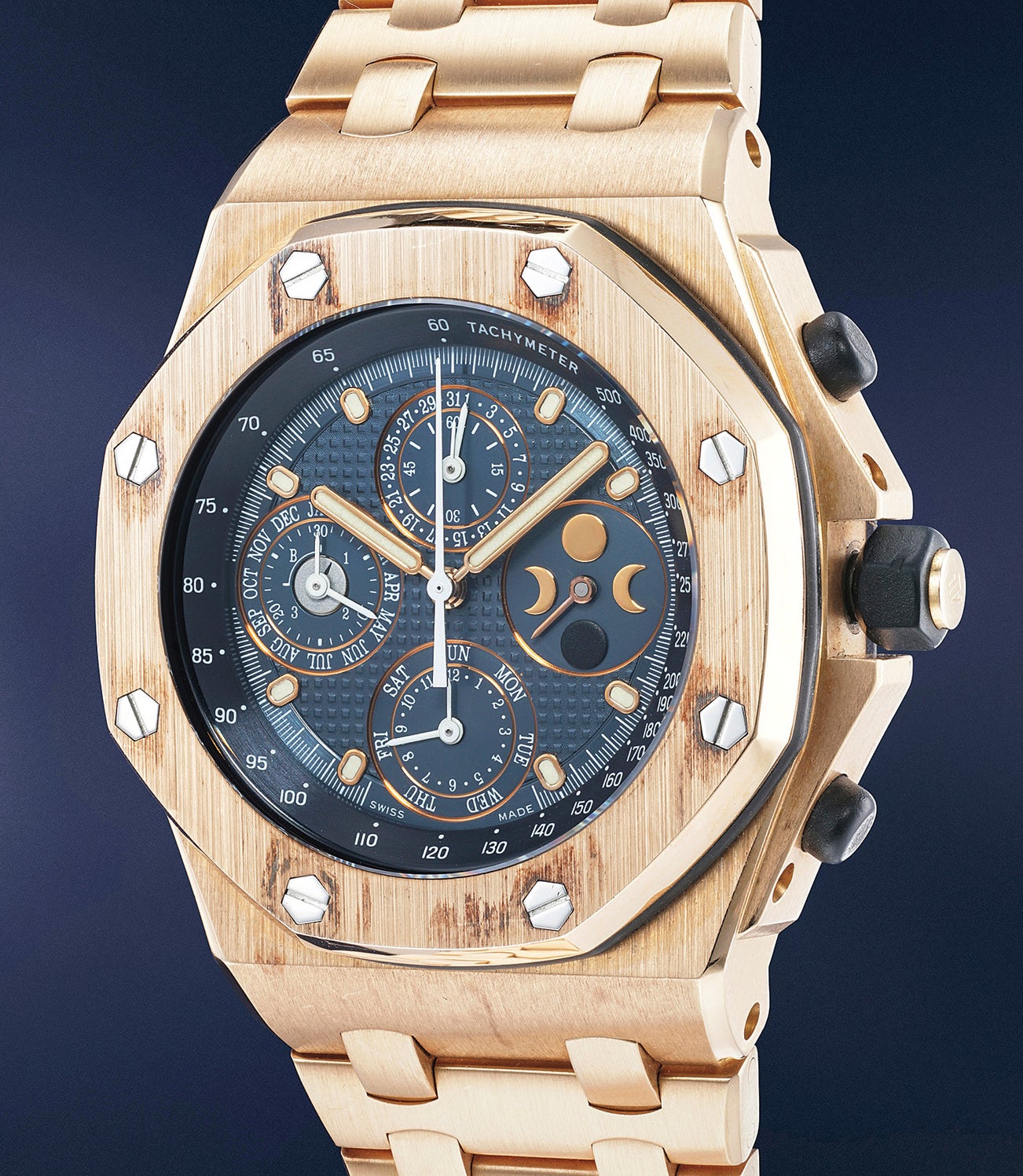 The present watch is a very rare and extremely impressive iteration of that famed design. Featuring a prestigious perpetual calendar and moon phase indication in addition to a chronograph function, this specimen of reference 25854 not only is the hardly ever seen pink gold version - a true statement of luxe in itself. Made in 1999, it furthermore represents the first series of the model, distinguished by a different dial design featuring double metal rimming to the subsidiary counters and different graphics (most notably, first series examples feature a radial disposition of the day of the month in the subdial at 12 o’ clock). Finally, it remains in excellent condition: the layer of oxidation developed on the case amplifies the warmth of the timepiece and is telltale indication of a life mostly spent in the safety of a vault.