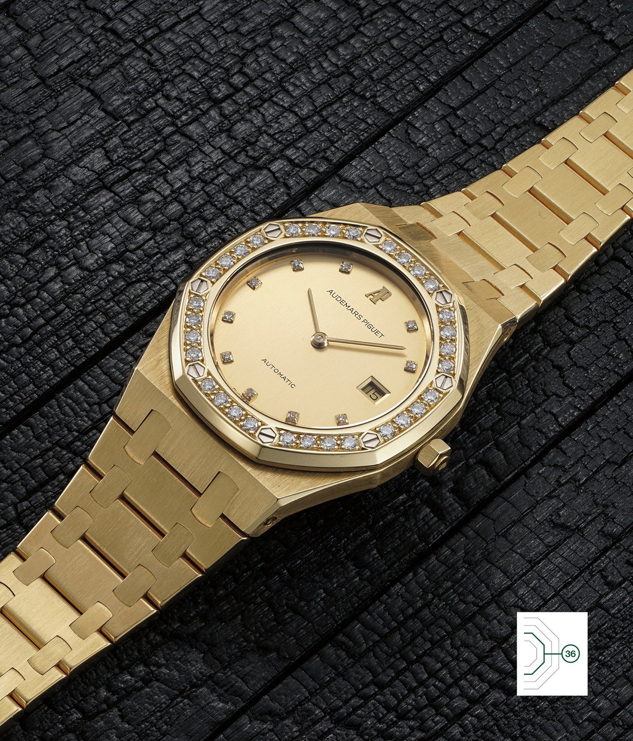 愛彼,非常優雅,黃金鏈帶腕錶,備香檳金色錶盤、鑽石錶圈、日期顯示,1989年製。
