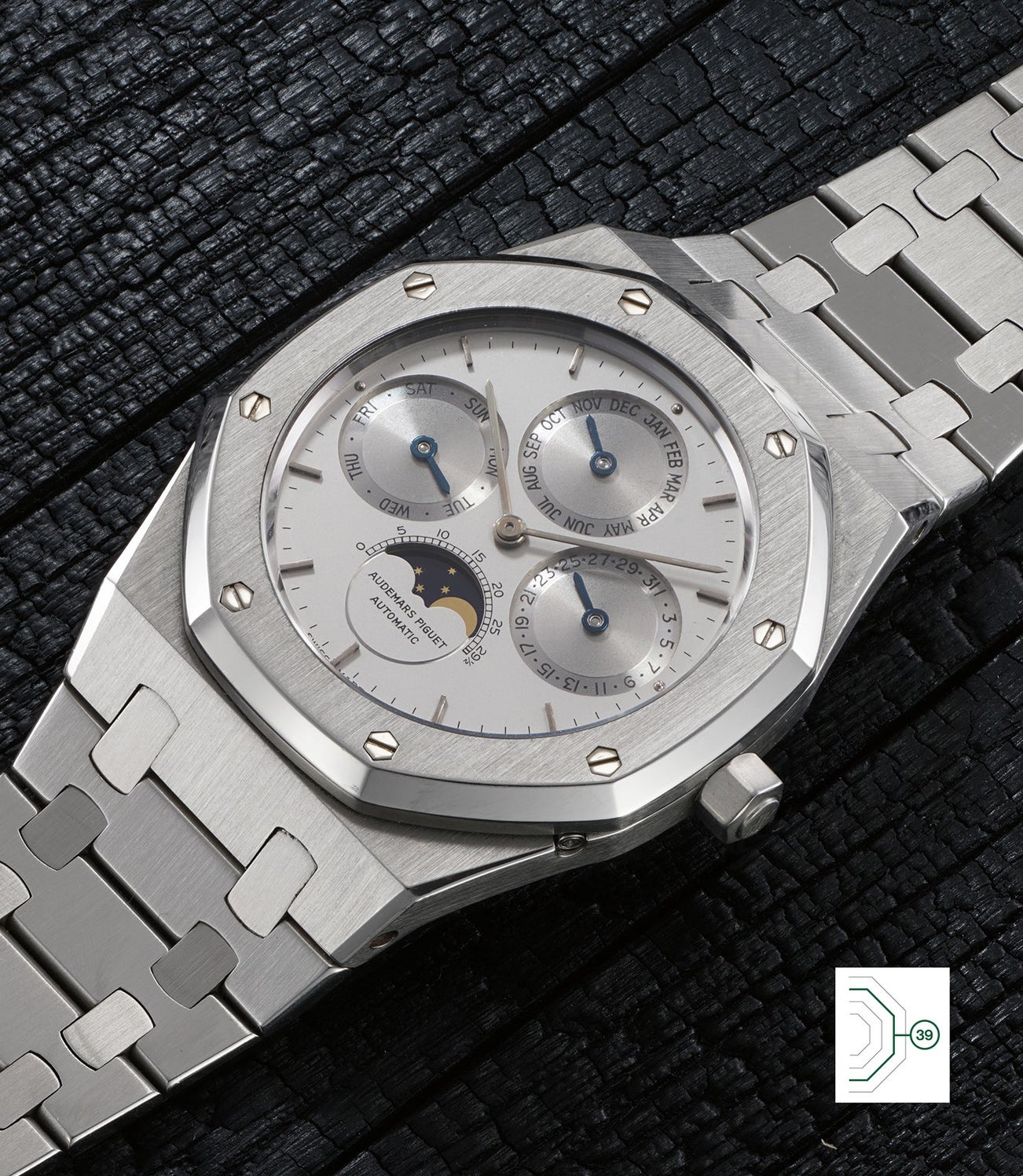 愛彼,精細罕有,精鋼萬年曆鏈帶腕錶,備月相顯示及備用珠母貝錶盤,1989年製。附上鍊錶盒及保證書