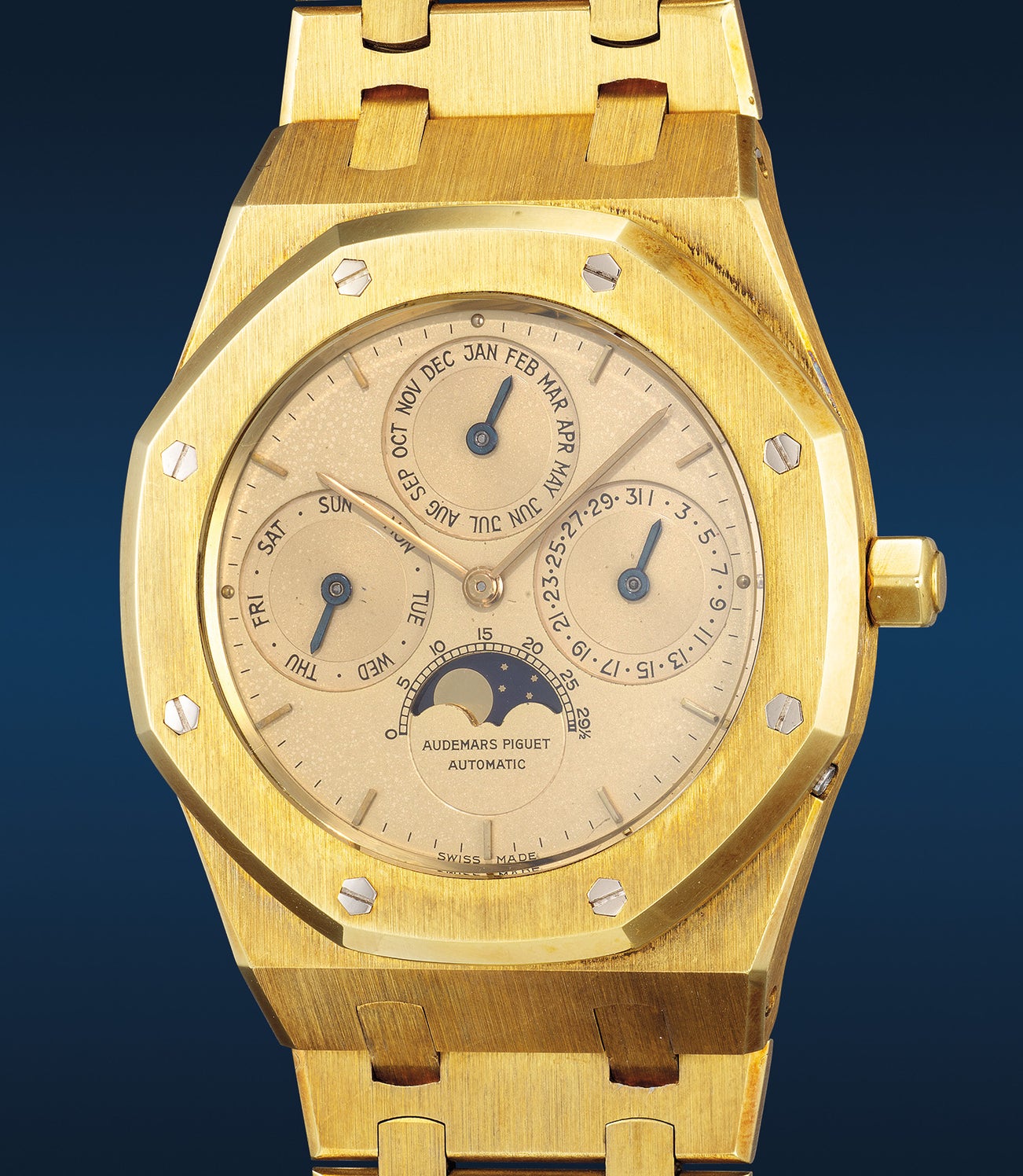 愛彼,「Royal Oak Perpetual Calendar」型號25654BA.OO.0944BA.01 ,精細罕有,黃金自動萬年曆鏈帶腕錶,備早期「MK I」錶盤、月相顯示,錶殼編號666號,1990年製。附後補證書
