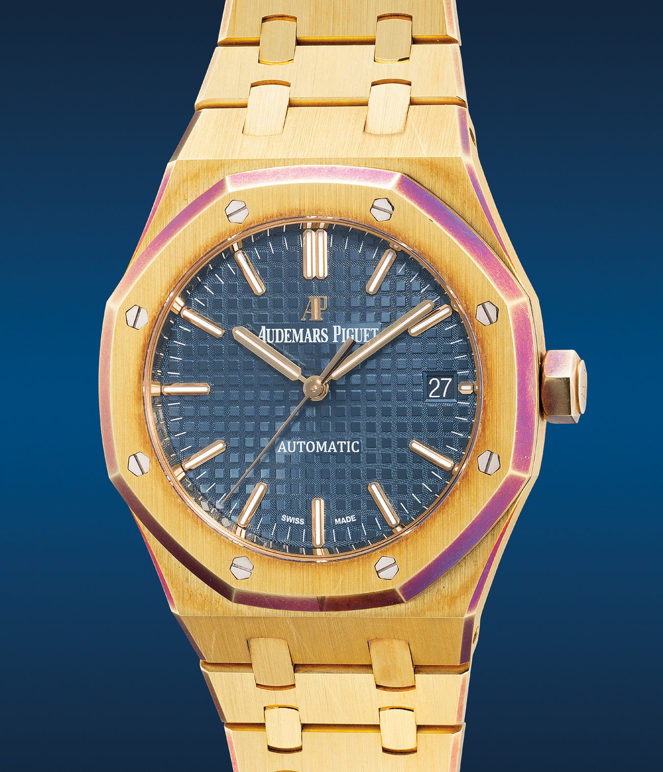 The present example Audemars Piguet Royal Oak ref. 15450BA from circa 2017 with a blue dial is offered in an attractive overall condition with a layer of patina that has developed around the bezel and case stating its prolonged period of inactivity.