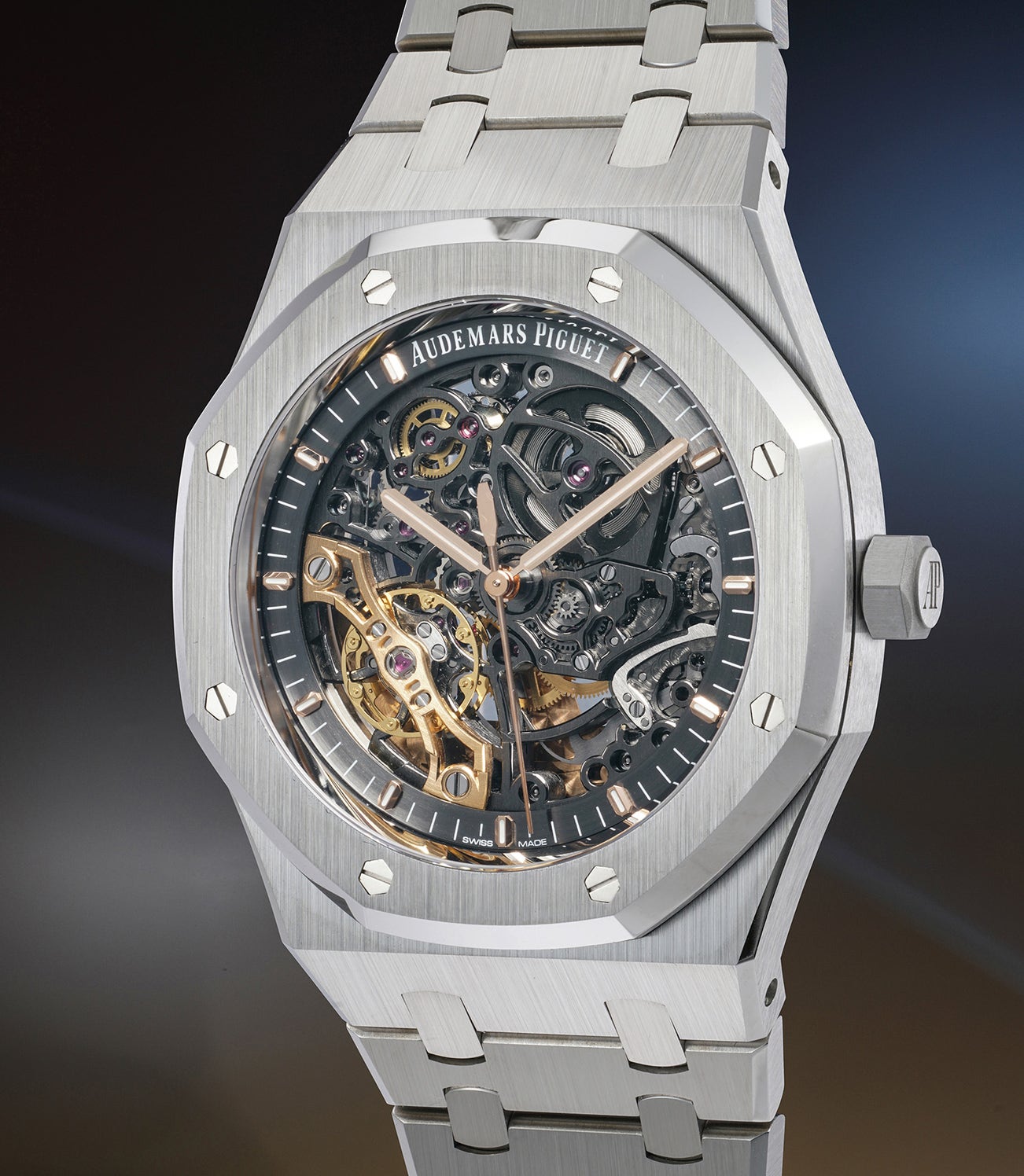 Adding extra flair to an already breathtaking, watch Audemars Piguet has uses a pink gold balance bridge which creates a bold contrast with the slate grey of the movement.