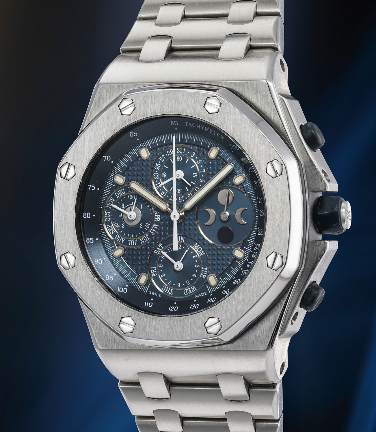 愛彼,十分精細,大型精鋼萬年曆計時鏈帶腕錶,備月相顯示。附證書