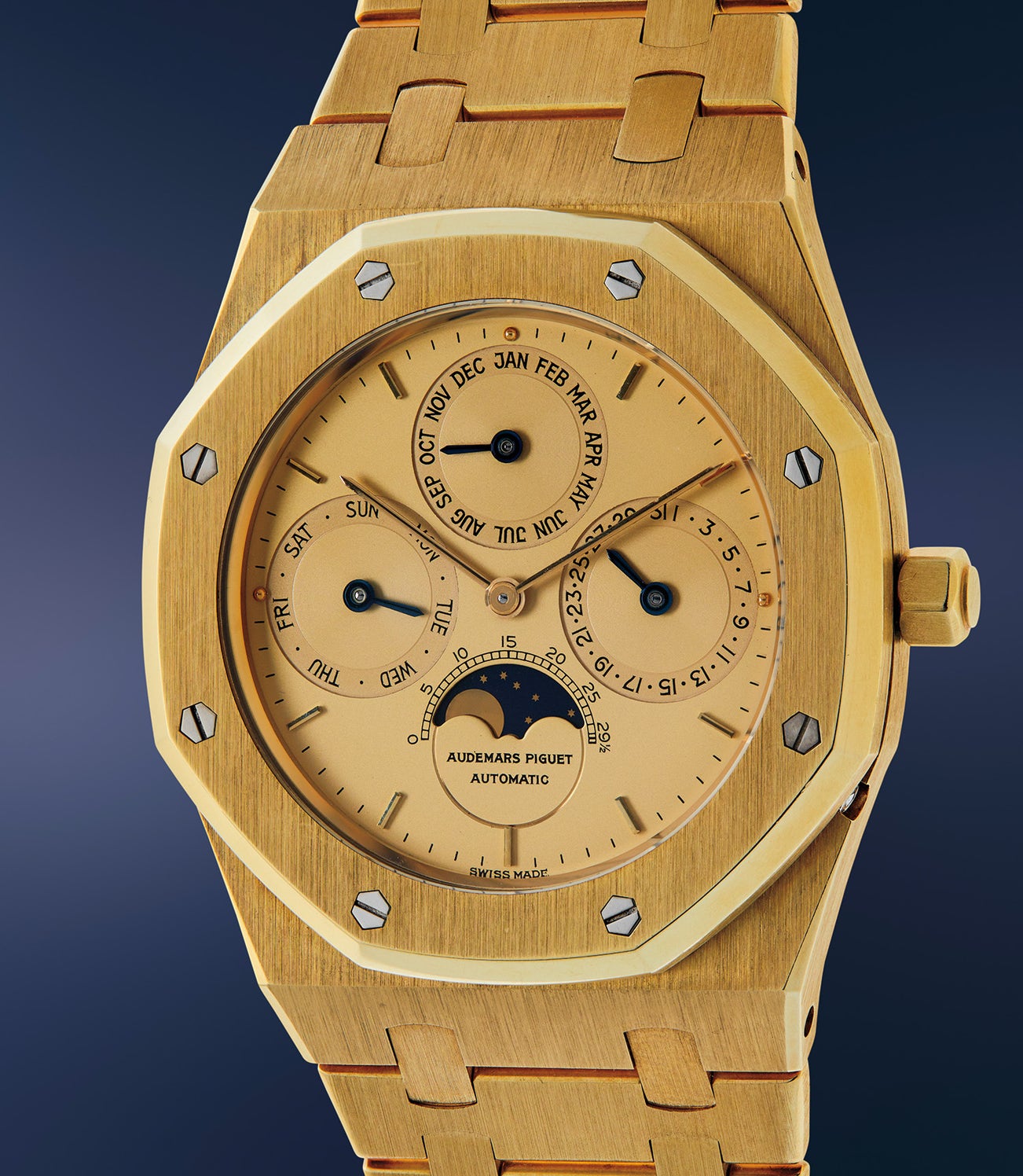 The Royal Oak Perpetual Calendar was launched in 1984. The forward-thinking approach from the Managing Director of Audemars Piguet at the time, George Golay, took the thin workhorse caliber 2120/2800, added an ultra-slim perpetual calendar module, and fitted it into the already slim Royal Oak case, making it one of the world’s thinnest automatic perpetual calendar watch.