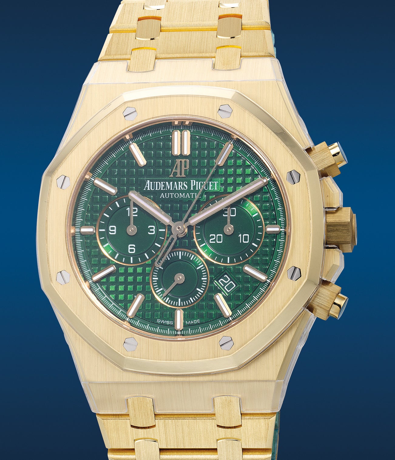 愛彼,「Royal Oak Chronograph 41」型號26331BA.OO.1220BA.02,精細,黃金自動計時鏈帶腕錶,備綠色錶盤、日期顯示,限量發行125枚,約2021年製。附原裝證書、錶盒、配件。本拍品的部分收益將使用於慈善用途