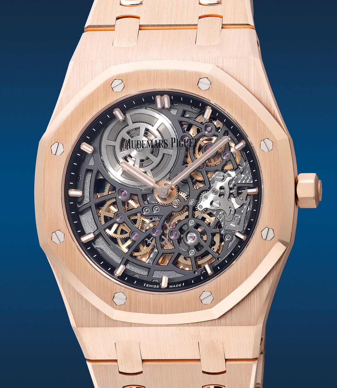 愛彼,「Royal Oak Jumbo Extra-Thin Openworked」型號16204OR.OO.1240OR.01,精細,玫瑰金鏤空自動鏈帶腕錶,特為「Royal Oak」五十周年紀念發行,約2022年製。附原裝證書、錶盒、配件