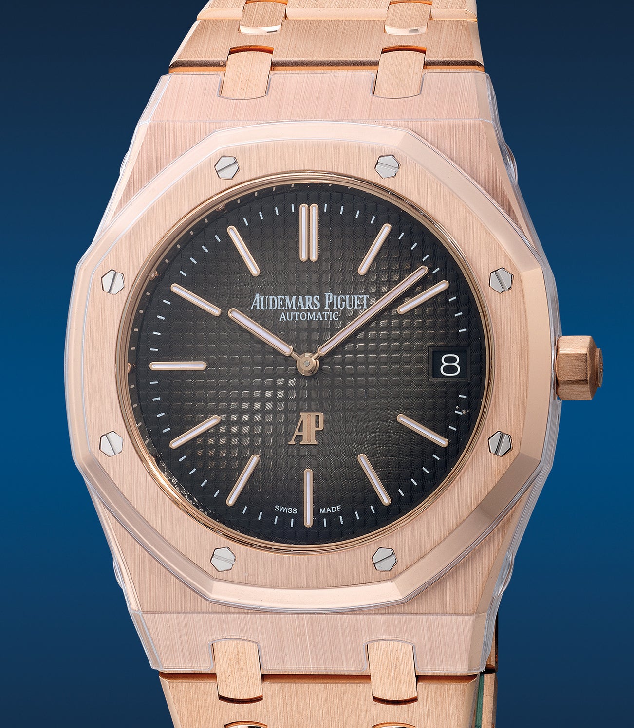 愛彼,「Royal Oak, Jumbo Extra-Thin」型號16202OR.OO.1240OR.01,極度精細,玫瑰金超薄自動鏈帶腕錶,備灰色煙燻錶盤、日期顯示,特為「Royal Oak」五十周年紀念發行,約2022年製。附錶盒、原裝證書、配件。本拍品的部分收益將使用於慈善用途