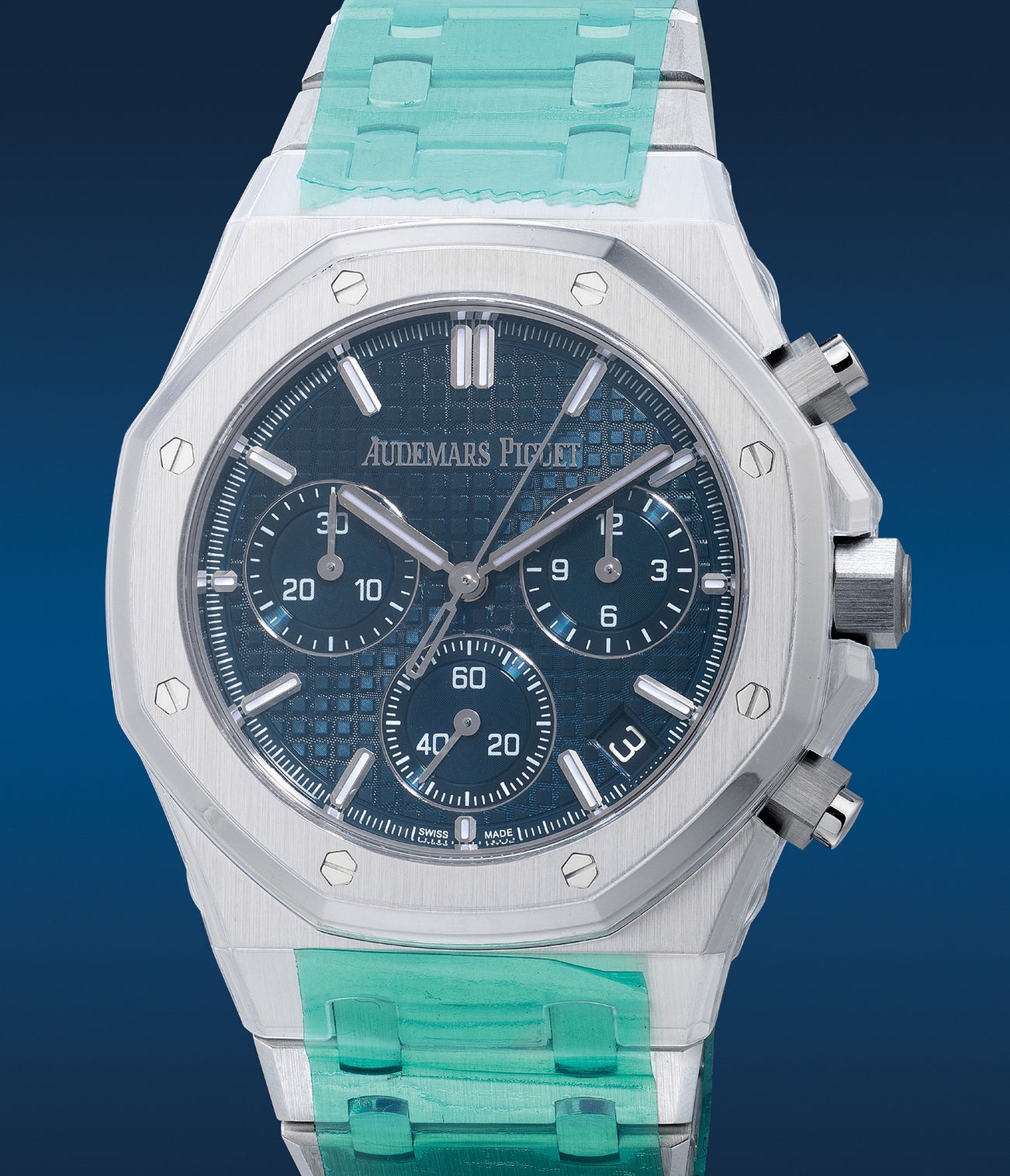 愛彼,「Royal Oak Chronograph 41」型號26240ST.OO.1320ST.01,精鋼自動計時鏈帶腕錶,備藍色錶盤、日期顯示,特為「Royal Oak」五十周年紀念發行,約2022年製。附原裝證書、錶盒、配件 本拍品的部分收益將使用於慈善用 途