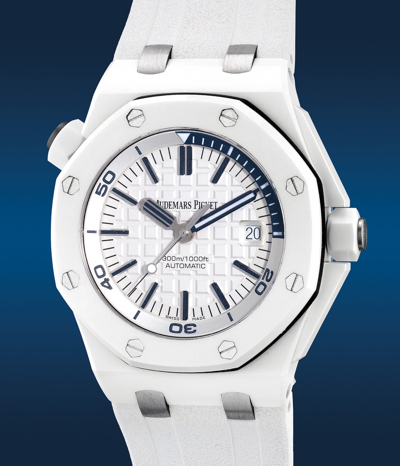 愛彼, 「 Royal Oak Offshore Diver」型號15707CB.OO.A010CA.01, 精細罕有, 白陶瓷鈦金潛水雙錶冠自動腕錶,備中心秒針、日期顯示,約2014年製。附原廠證書、錶盒