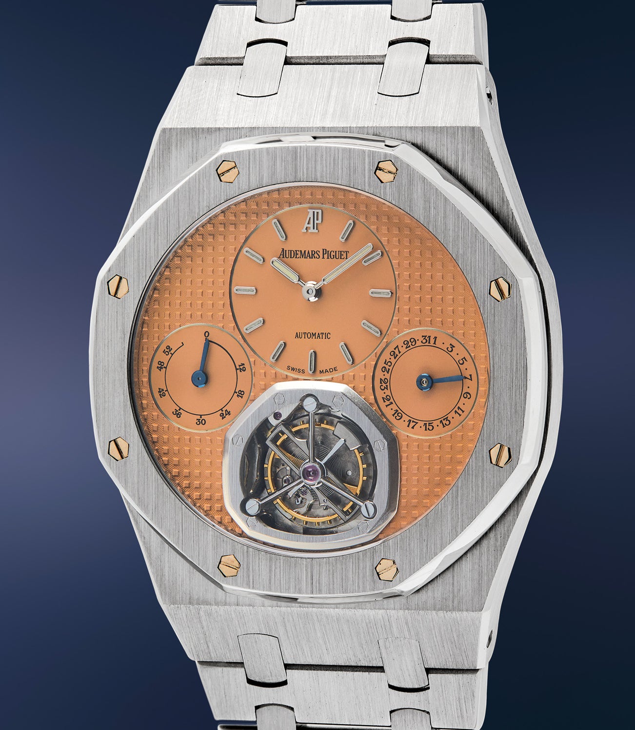 愛彼,精美,限量版精鋼陀飛輪鏈帶腕錶,備日期顯示、「Salmon」錶盤,為紀念「Royal Oak」二十五周年限量發行。