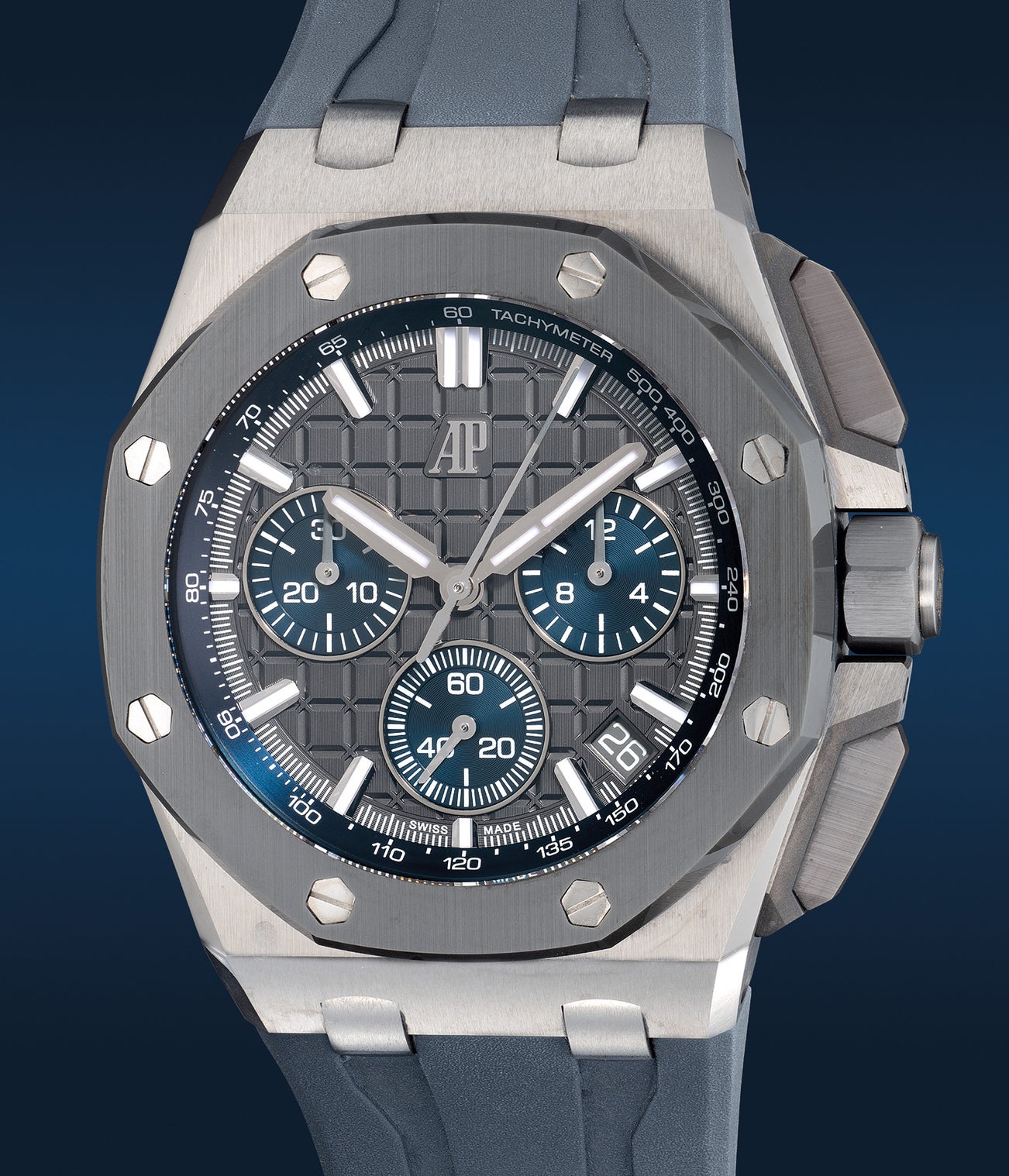 愛彼,「Royal Oak Offshore Chronograph」型號26420IO.00.A009CA.01,精細,鈦金及灰色陶瓷自動飛返計時腕錶,備日期顯示,約2021年製。附錶盒、原裝證書