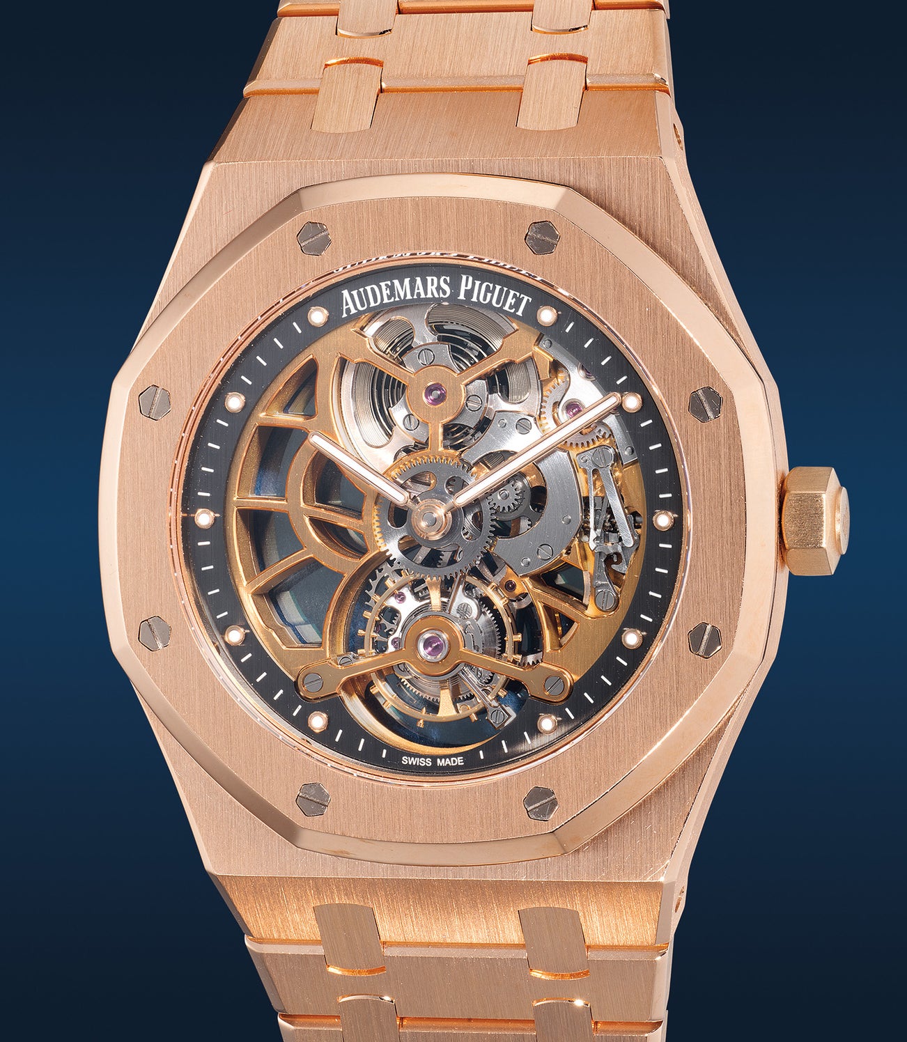 愛彼,「Royal Oak Tourbillon Extra-Thin Openworked」型號26518OR.OO.1220OR.01,極度精細罕有,限量版玫瑰金超薄鏤空陀飛輪鏈帶腕錶,限量發行50枚,約2018年製。附原裝證書、錶盒、配件