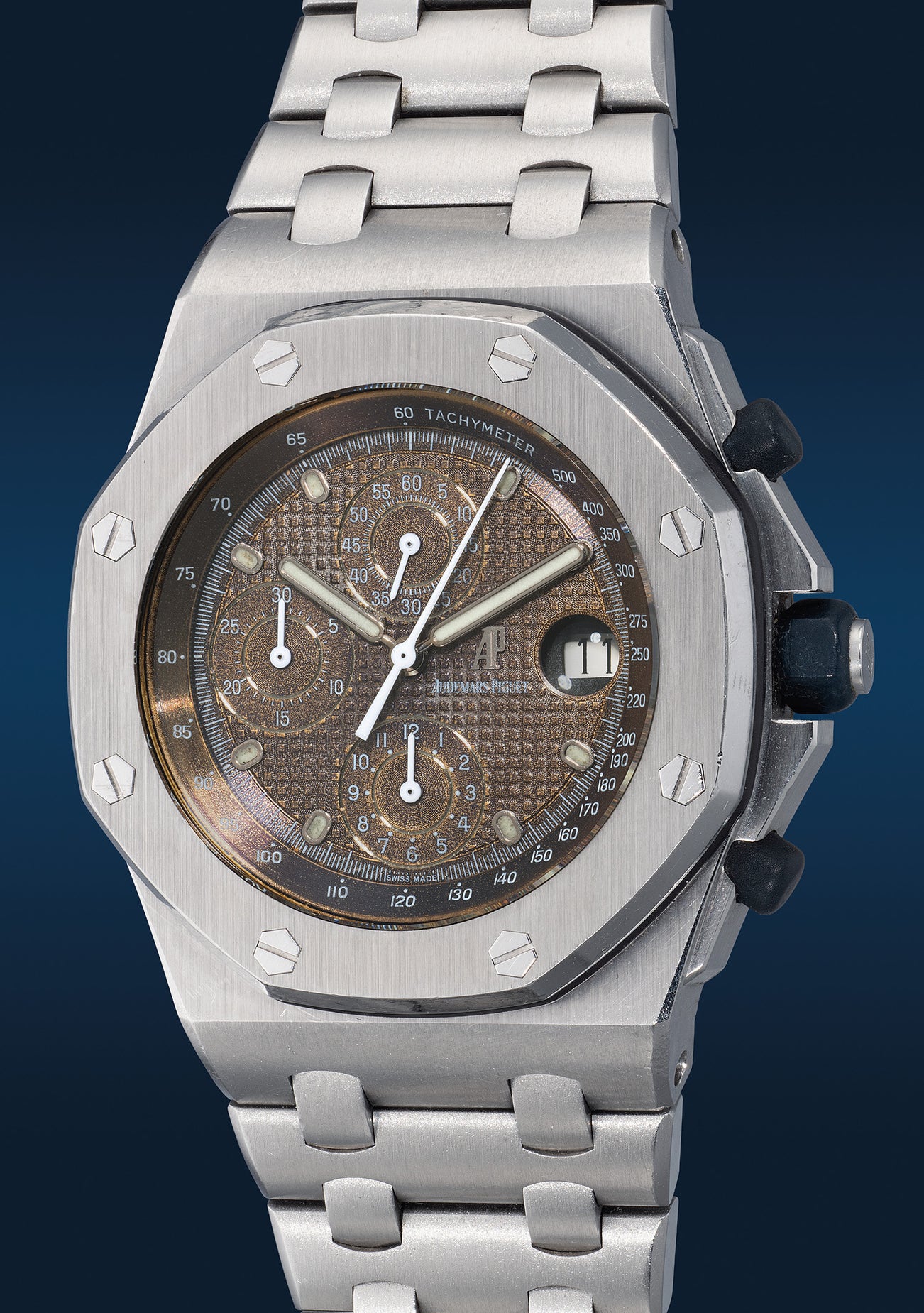 愛彼,「 Royal Oak Offshore “The Beast” 」型號 25721ST/O/1000ST/01,精細罕有,精鋼自動計時鏈帶腕錶,備「Tropical」棕色錶盤,約2000年製。附原裝證書
