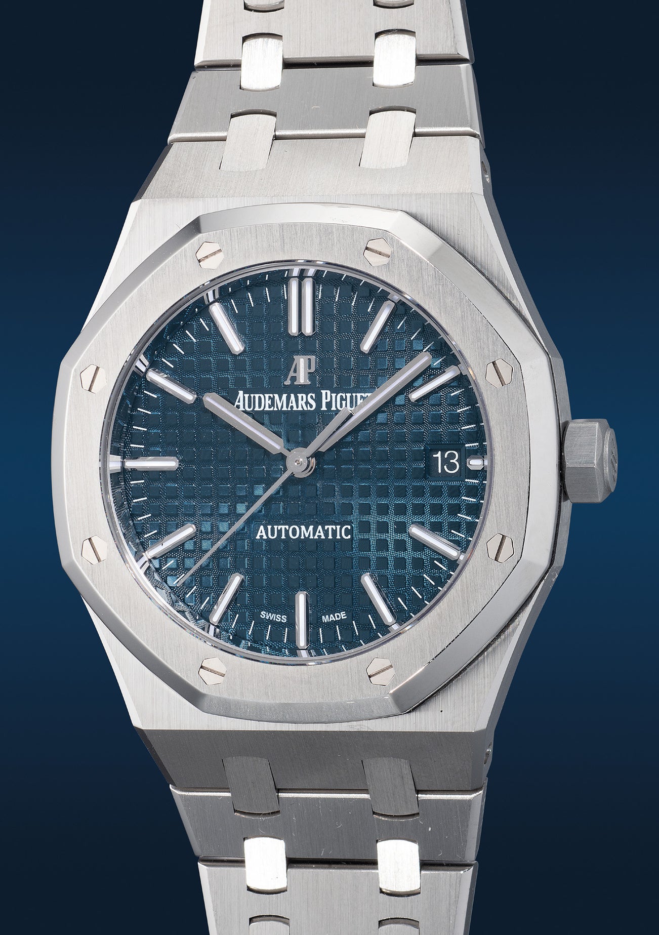 Continuing the legacy of its predecessor, the ref. 15450ST appeared as a mid-sized option in the Audemars Piguet catalogue in 2012. This three-handed timepiece is a Royal Oak through and through. Incorporating its core aesthetical DNA, it features the iconic multi-finished stainless steel case and bracelet, matched with a blue texturised dial.