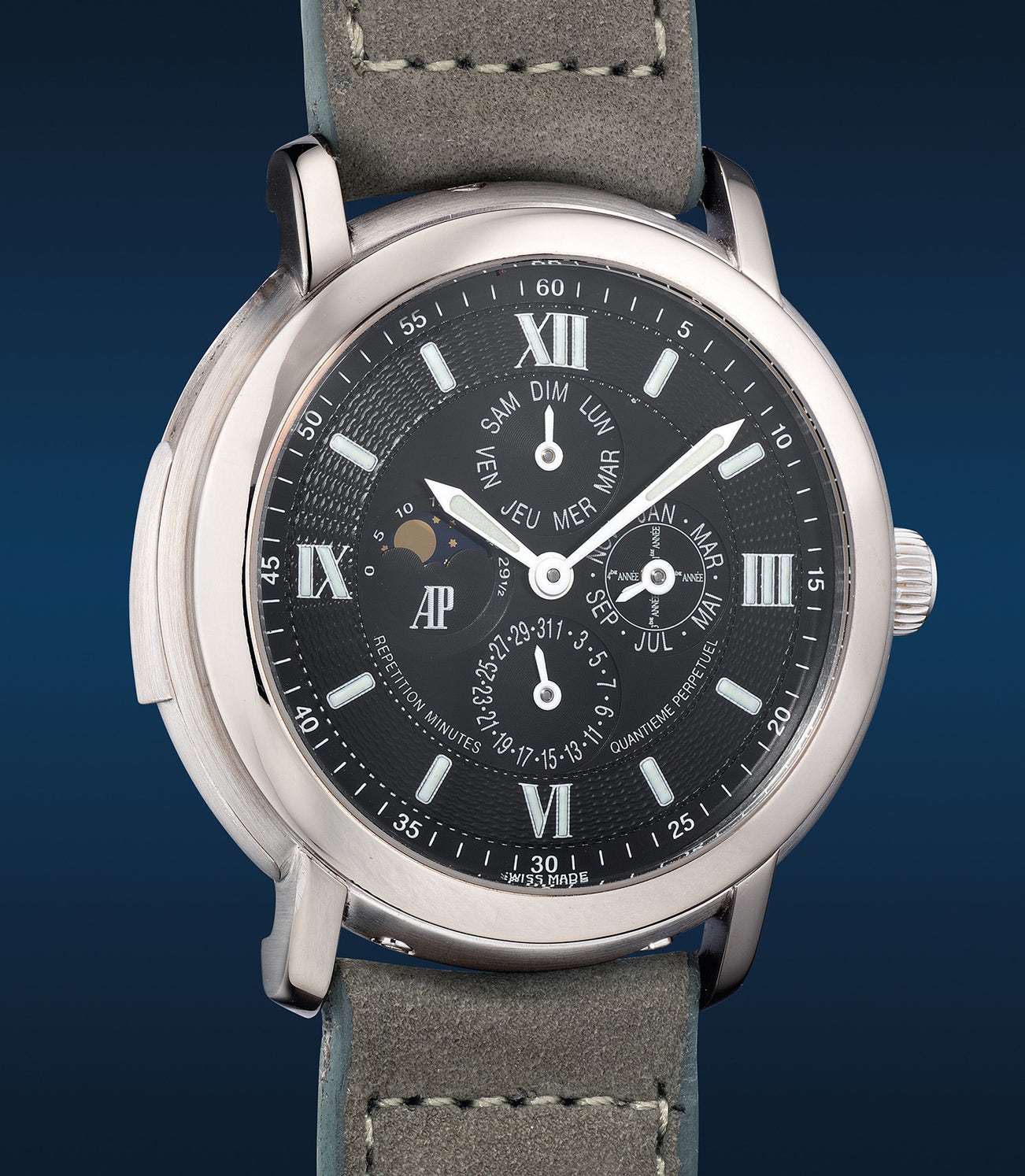 愛彼,「Jules Audemars Repetition Minutes Quantieme Perpetual」型號,白金三問報時萬年曆腕錶,備羅馬數字時標、月相、閏年顯示,約1997年製。附原裝證書、錶盒、調整筆