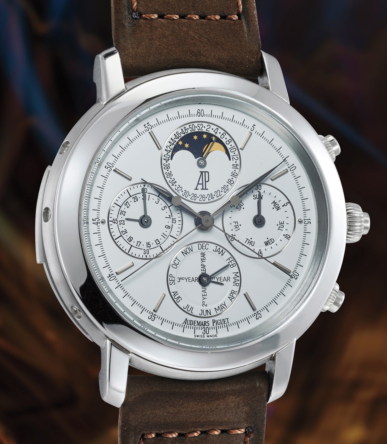 愛彼,精美罕有,三問鉑金追針計時萬年曆腕錶,備月相及閏年顯示。