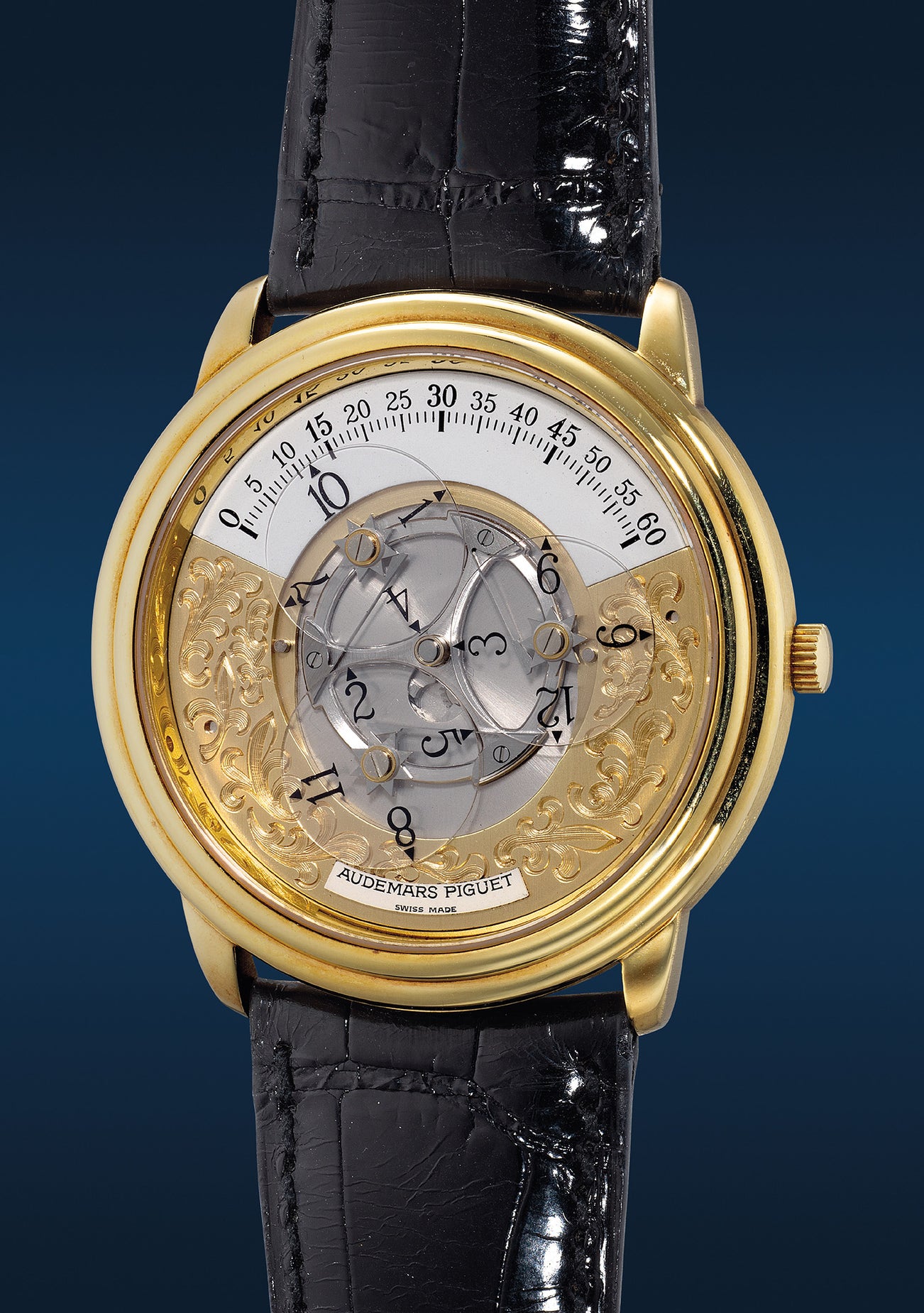 愛彼,「Star Wheel」型號25720BA.OO.A002.02,精細獨特,黃金自動半鏤空雕刻腕錶,備轉盤式讀時設計, 1993年製。附原裝證書、錶盒、配件、後補證書
