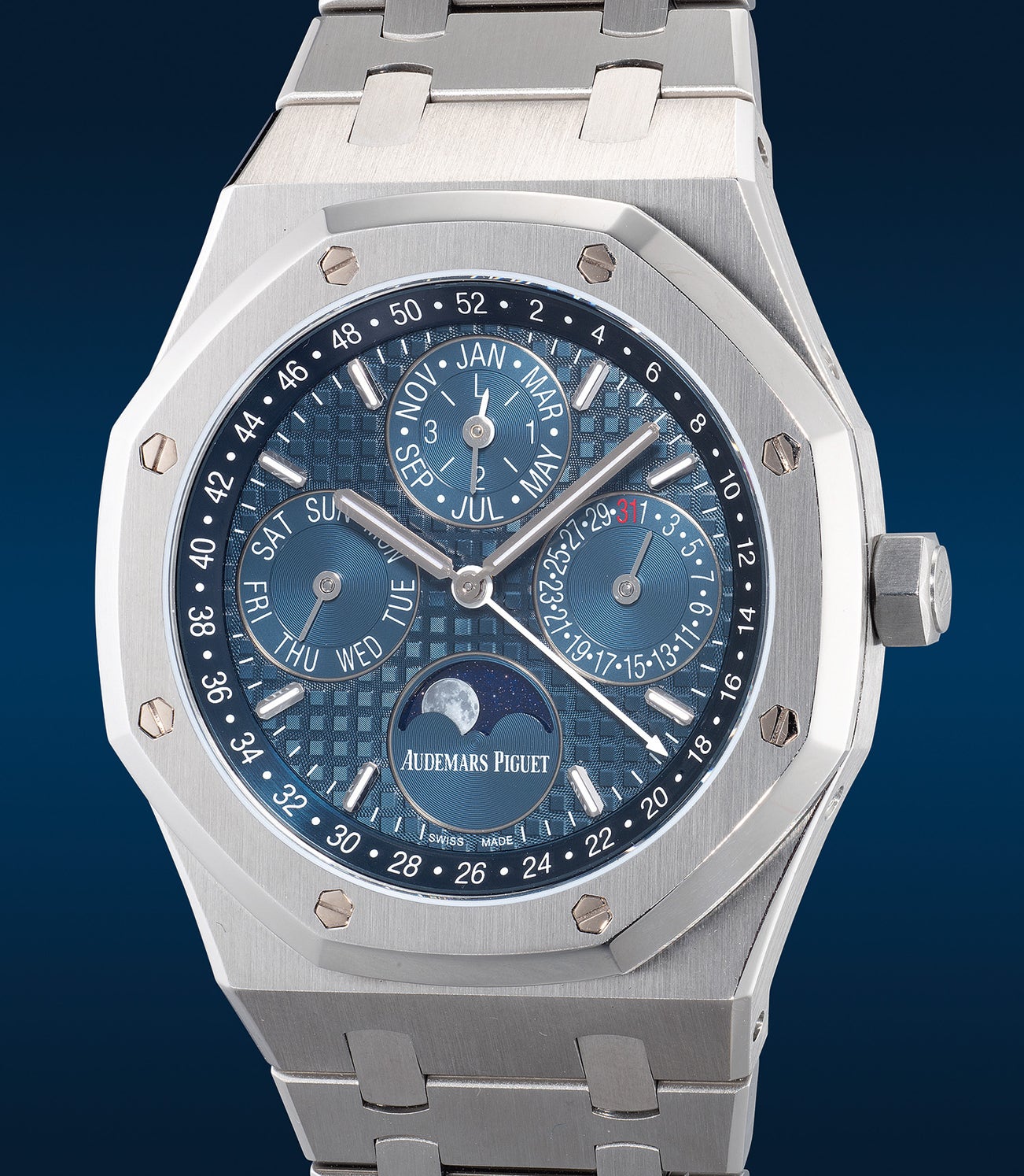 Audemars Piguet unveiled the ref. 26574 in 2015 as a modern interpretation of the coveted Royal Oak perpetual calendar. With a larger 41mm case and the new self-winding cal. 5134, the ref. 26574 offered increased presence on the wrist while retaining a slim profile for comfort. The handsome blue "grand tapisserie" dial contrasts elegantly with the refined white gold indices, enhancing legibility. Additionally, the 52-week indicator and photorealistic moonphase with starry skies at 6 o'clock demonstrate Audemars Piguet's dedication to fine craftsmanship.
